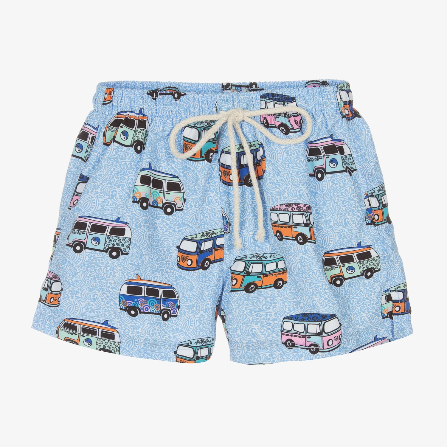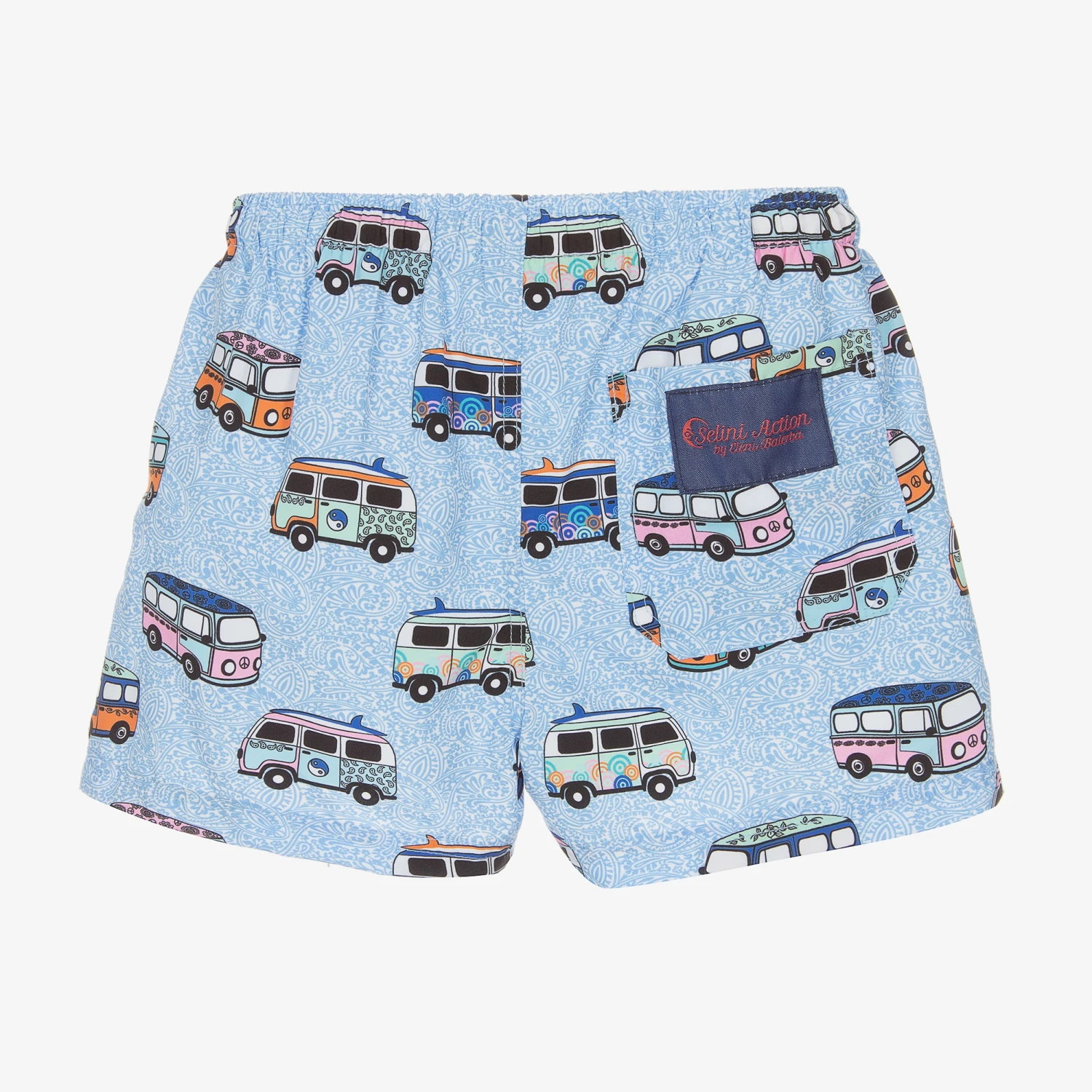 Boys pale blue, orange and pink swim shorts from Selini Action, with a branded pocket on the back. Soft, silky and lightweight, the woven fabric is stamped with psychedelic paisley prints and ’60s camper vans. To ensure the best fit, the waist is adjustable with an ivory rope drawstring. These comfortable shorts are lined with soft and breathable cotton-blend mesh.