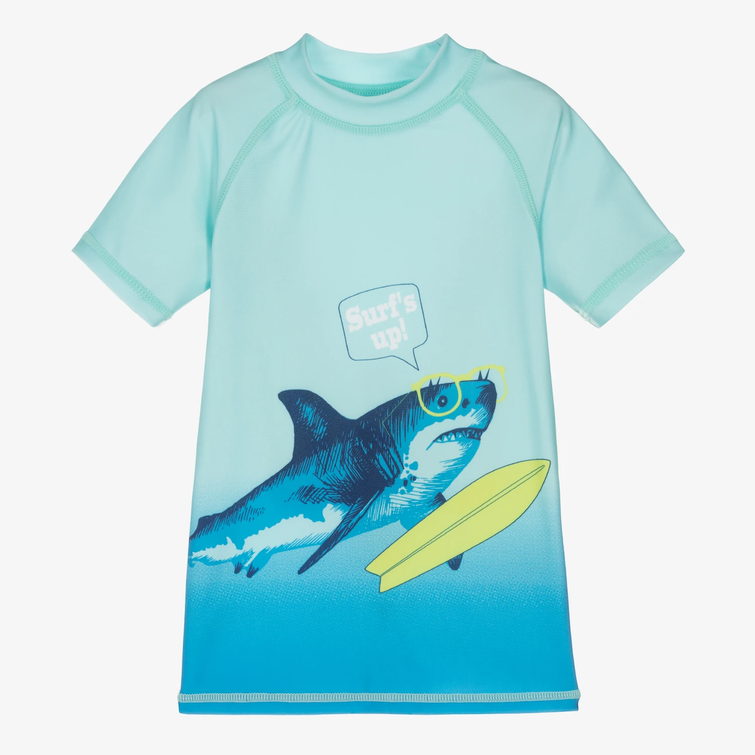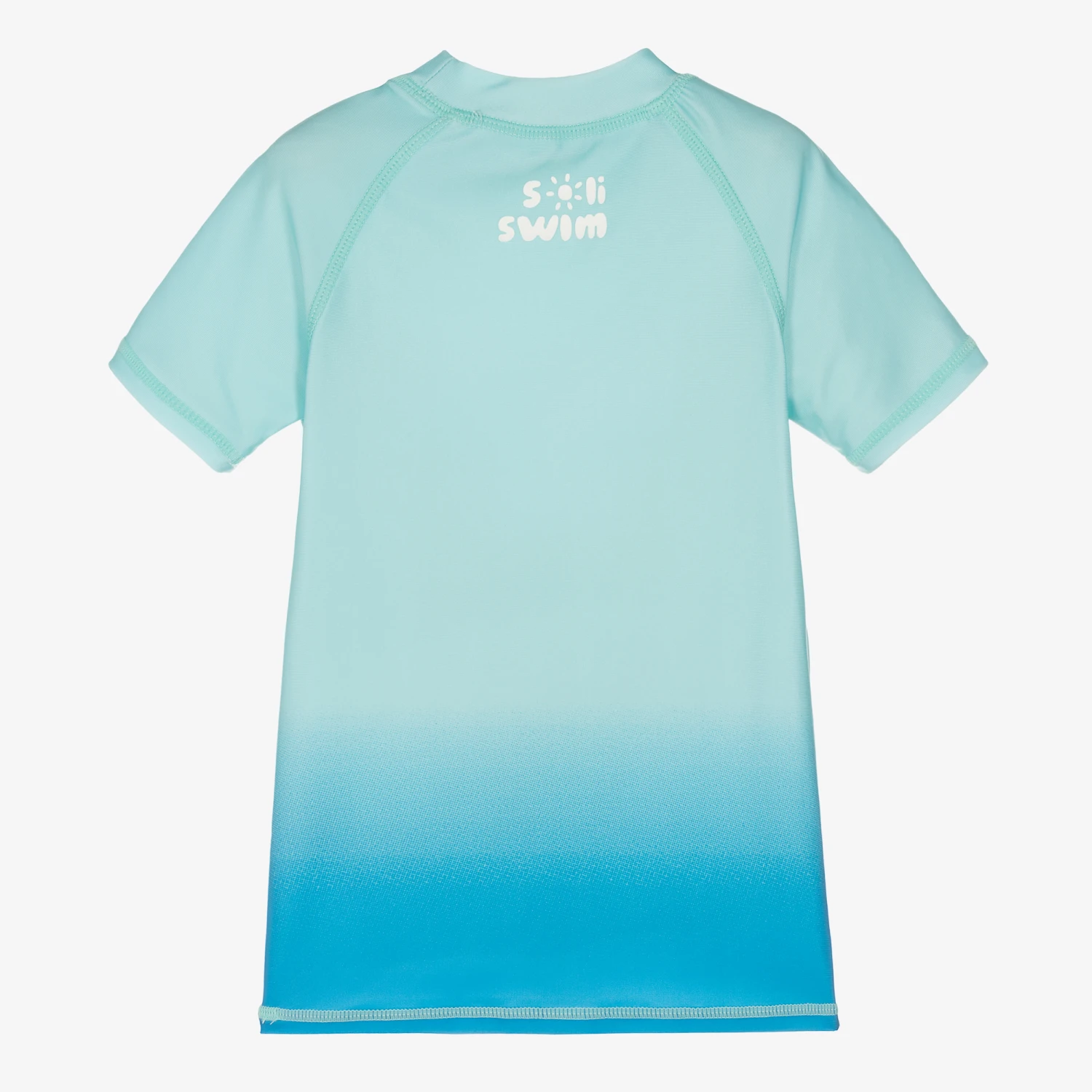 A blue gradient-effect sun top for boys, by Soli Swim, with a cool surfer shark print. Ensuring your child stays safe while having fun in the water, this top has UPF50+ sun protection, covering the back and shoulders. It is made from a smooth recycled fabric, and is stretchy for comfortable wear.
