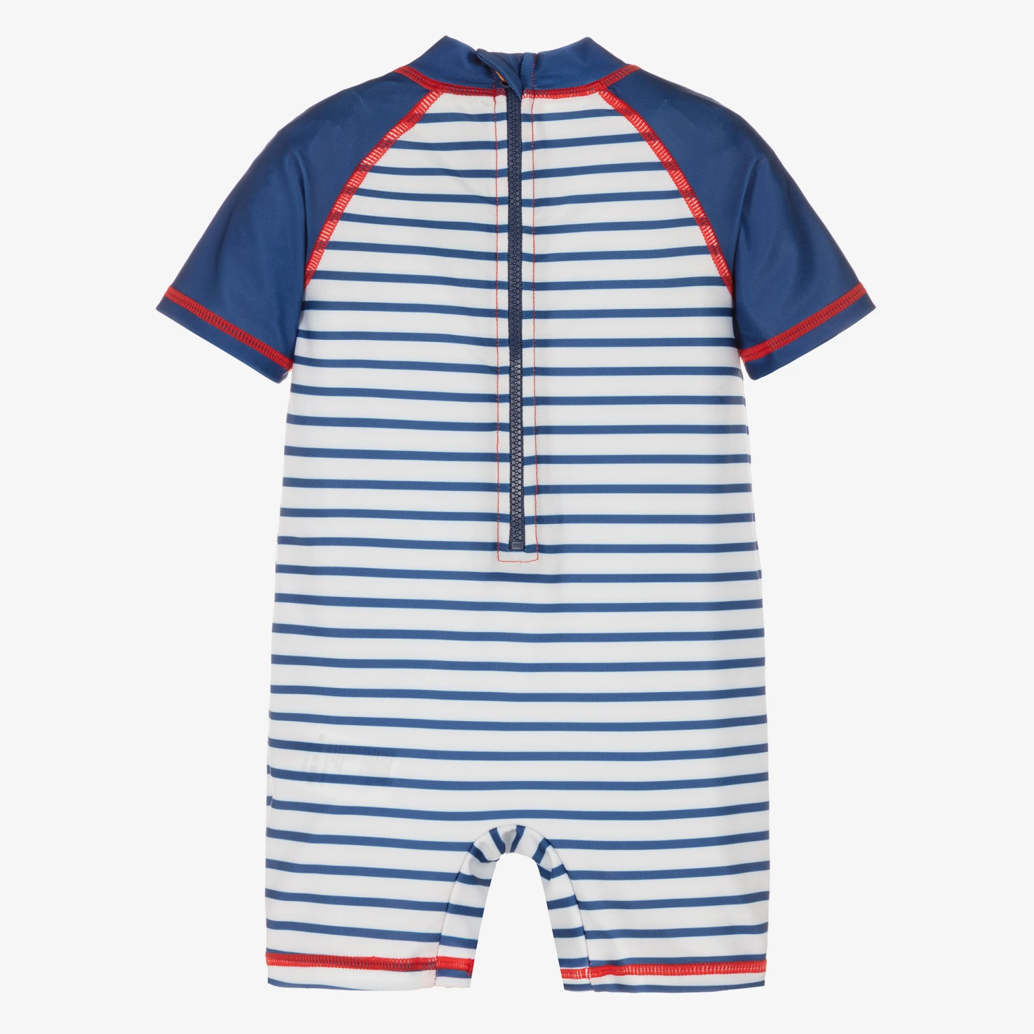 A nautical-inspired blue and white striped sun suit for little boys by British swimwear brand Soli Swim. Made with UPF50+ fabric, this silky soft and stretchy one-piece has a sailing boat motif on the front with coordinating red topstitching. It has a comfortable high neckline and an exposed zip fastening on the back for easy dressing.