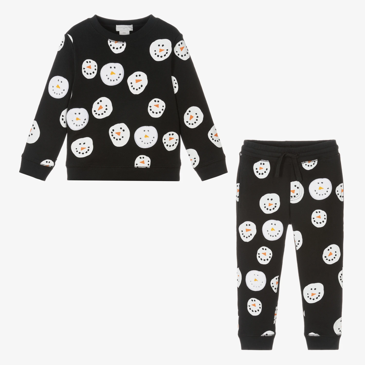 Black, organic cotton tracksuit for boys and girls by Stella McCartney Kids. Warm and cosy with a soft fleecy inside, the sweatshirt top has a festive, all-over snowman print with comfortable ribbed trims. The matching joggers complete the coordinating look with concealed side pockets, ribbed ankle cuffs and a comfortable drawstring waist.
