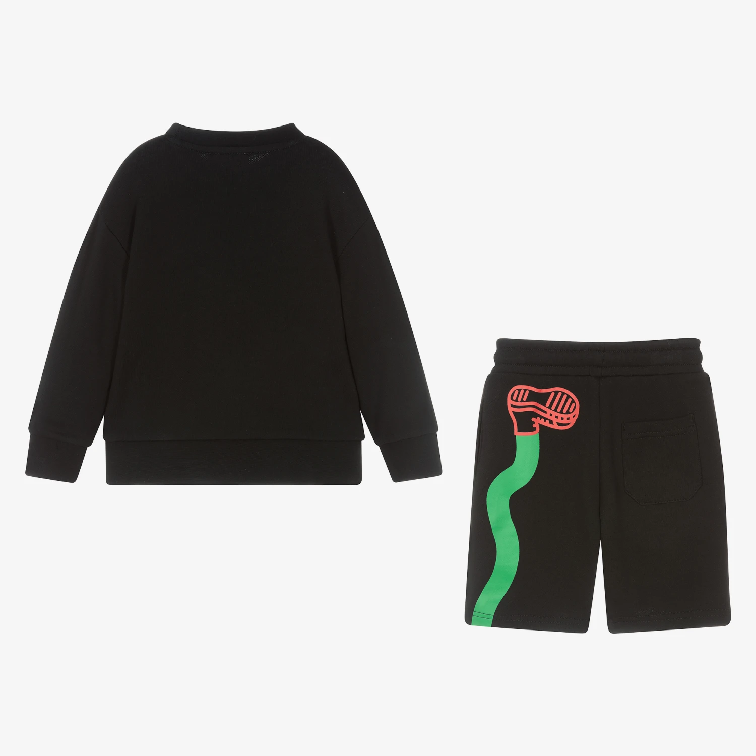 A black organic cotton tracksuit for boys from British label Stella McCartney Kids, made in soft, stretchy and mid-weight jersey. Stamped on both the sweatshirt and shorts are quirky red, green and blue dancing characters, with logo detailing for added designer touches. The sweatshirt has softly ribbed trims for comfort and the shorts have three pockets and a drawstring on the elasticated waist, gentle on little tummies. The Stella McCartney fit can be quite small so choose a size up if you want room to grow.