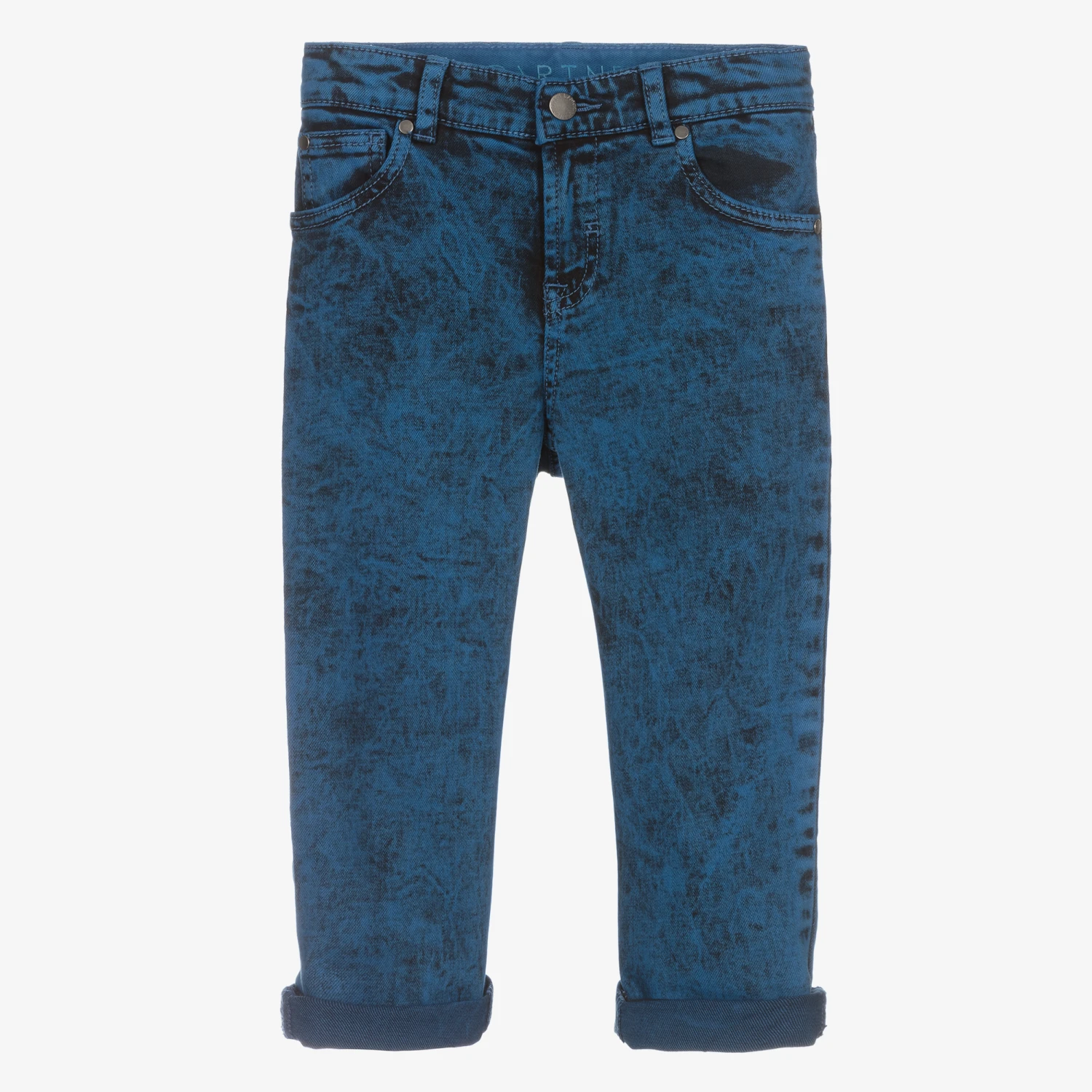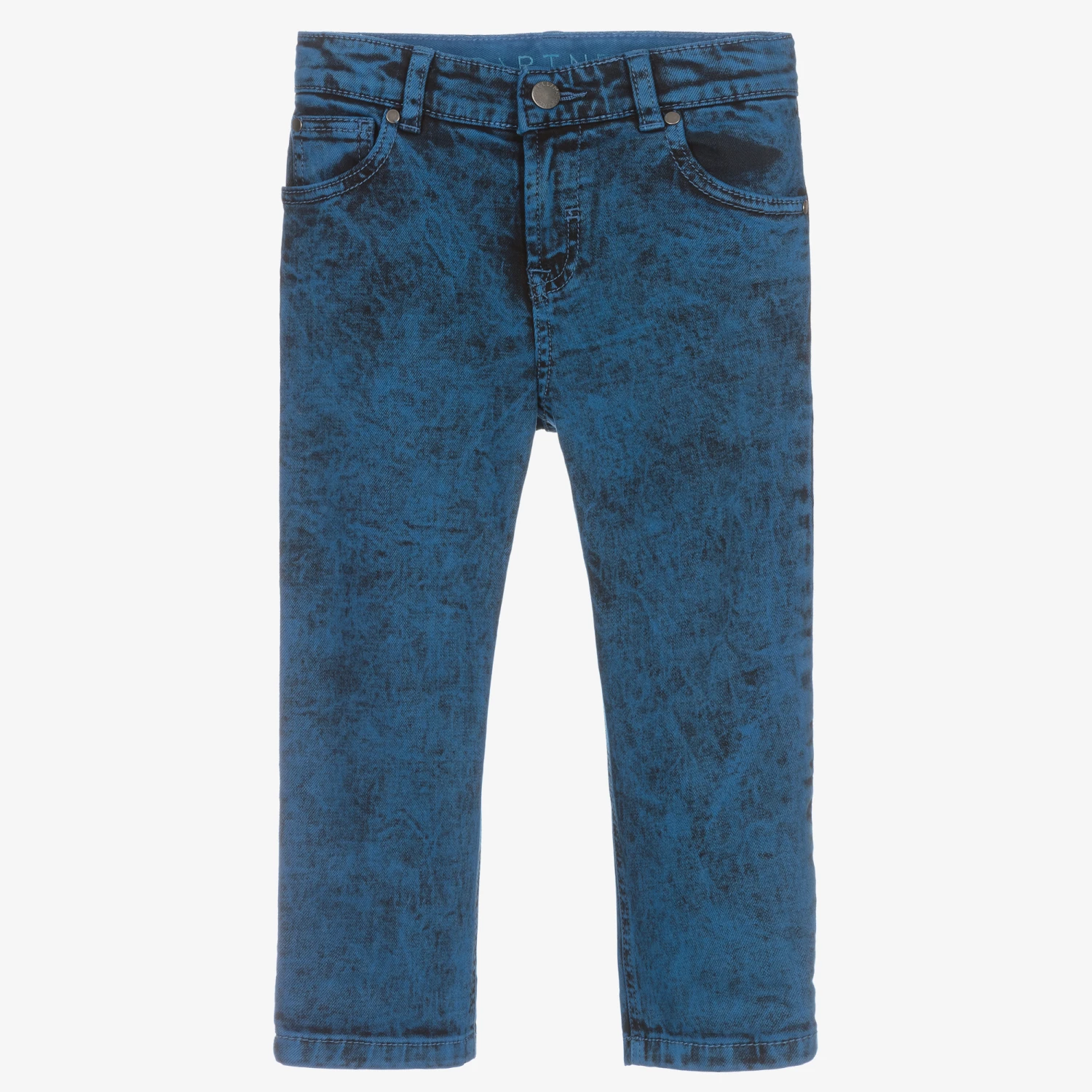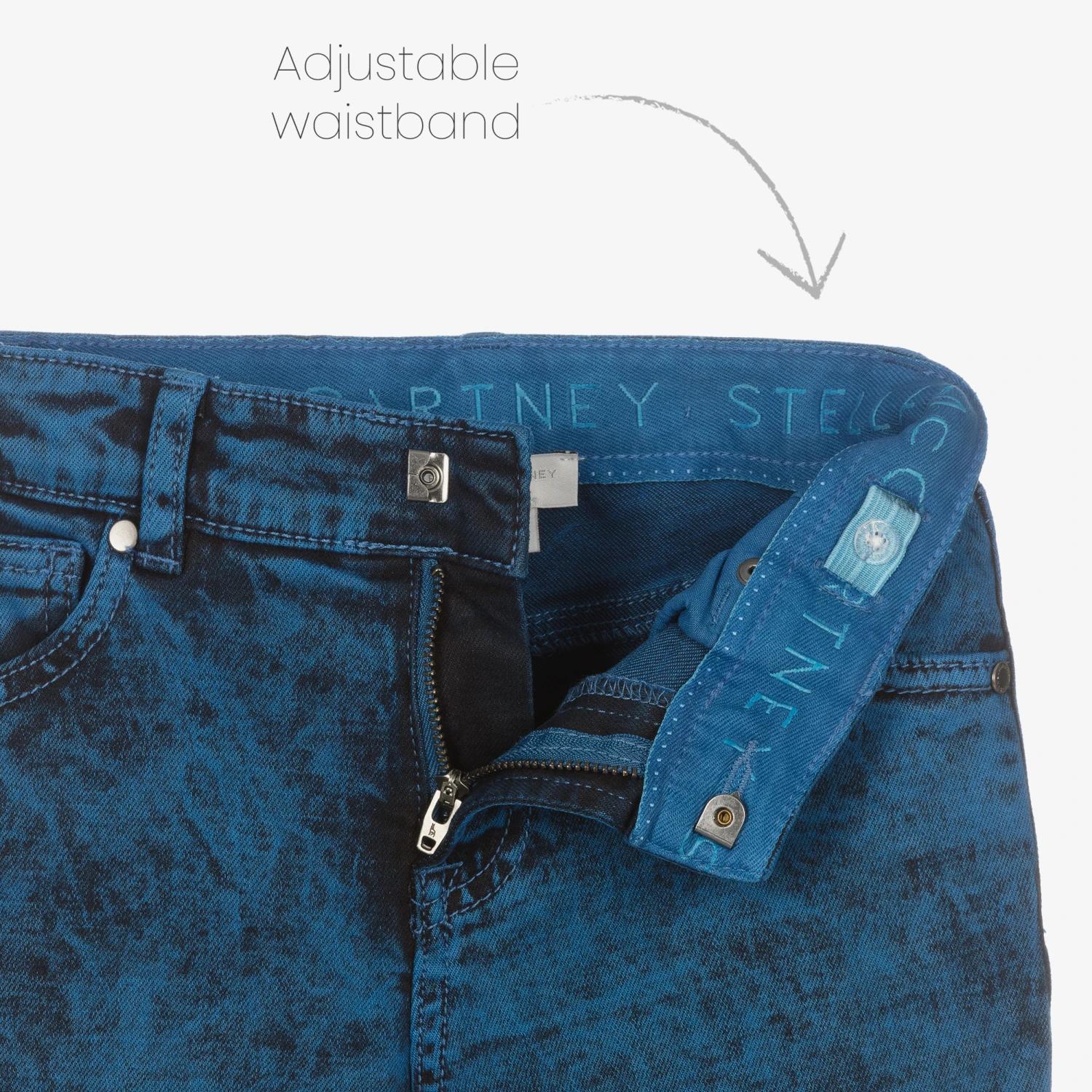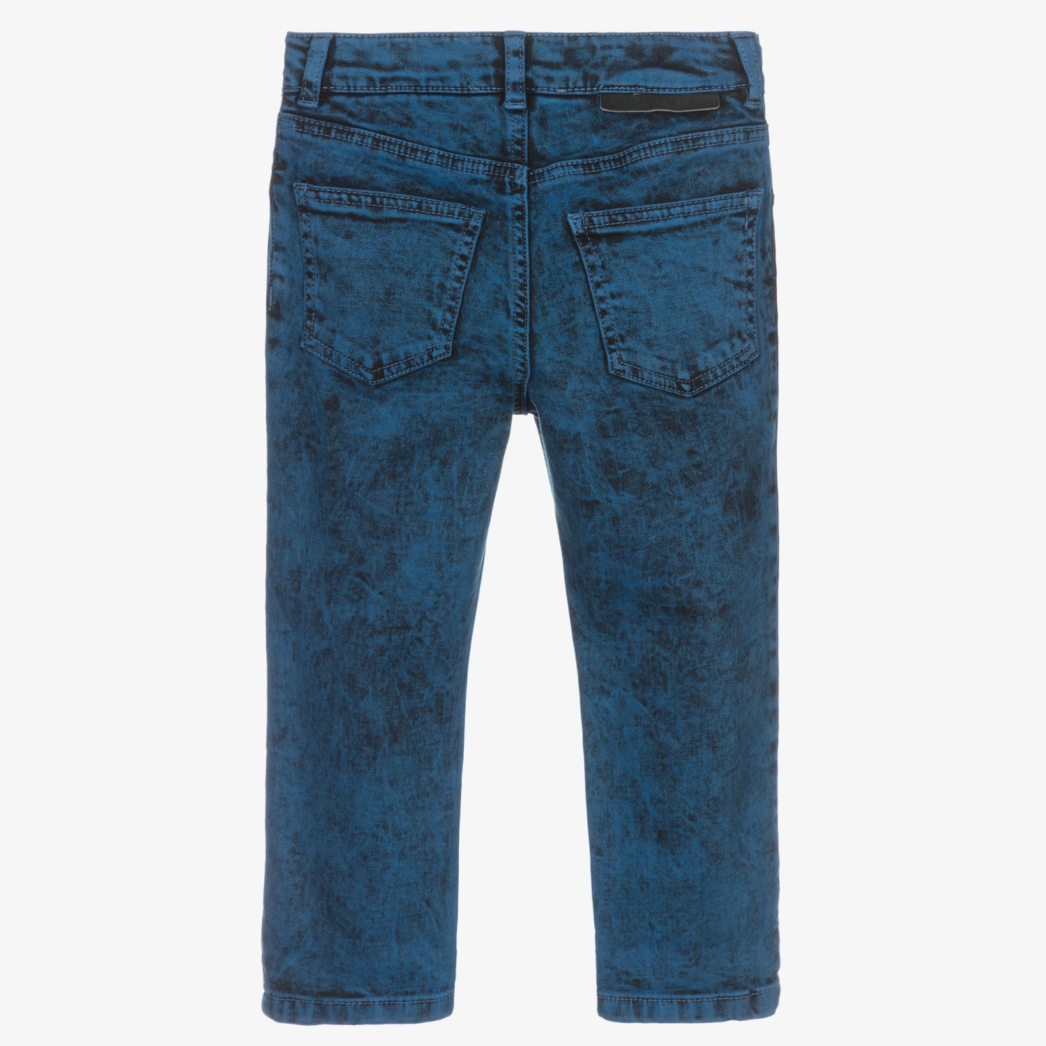 Blue five-pocket jeans for boys by British brand Stella McCartney Kids. In a comfortable relaxed fit, they are made in soft stretch denim, with a stylish acid wash effect. The waistband is adjustable to allow for growth spurts and is trimmed with logo embroidery on the inside. The logo tab on the back and the branded button fastening on the front add a statement finish.