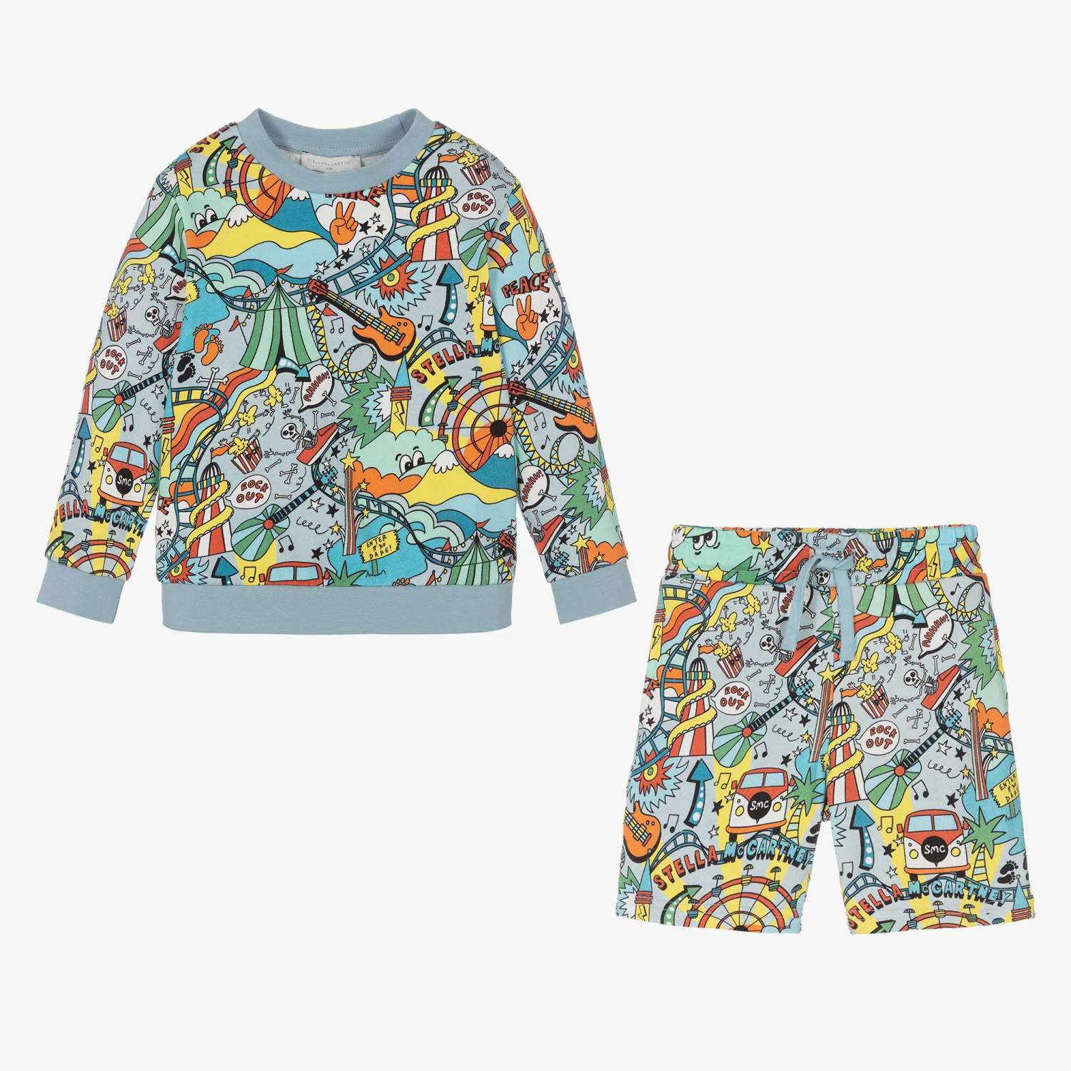 A pale blue organic cotton tracksuit for boys from British label Stella McCartney Kids. Both pieces are made in soft and stretchy sweatshirt jersey, with a cool psychedelic rollercoaster-themed print in vibrant hues. Logo details can be found amongst the quirky print for added designer appeal. The sweatshirt has softly ribbed trims for comfort and the shorts have three pockets and a drawstring on the elasticated waist, comfortable on little tummies. The Stella McCartney fit can be quite small so choose a size up if you want room to grow.