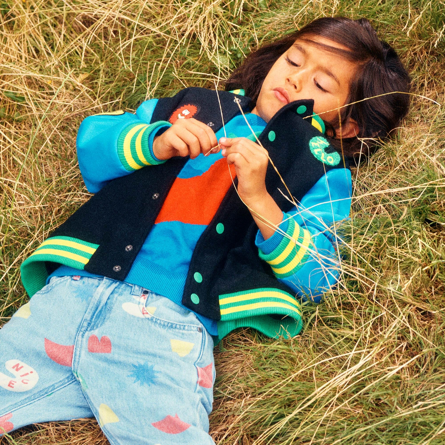 Fun and faded, these blue denim jeans for boys are by British brand Stella McCartney Kids. Made in organic cotton, they are patterned with colourful shapes and positive words, such as ‘smile’ and ‘nice’. With five pocket styling, they fasten with a logo hook and eye with a zip below. They have an adjustable waistband for a comfortable fit and a logo tab around the back.
