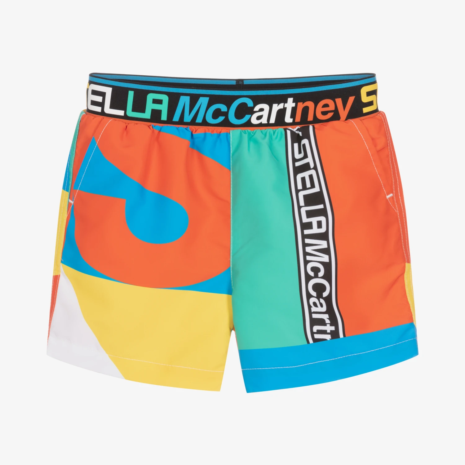 Colourful swim shorts for boys by Stella McCartney Kids. They have a logo-branded, elasticated waistband and logo taping down one leg, with pockets at the sides. They are lined in soft mesh for comfort and have a velcro-closing back pocket. This garment is made from recycled materials. The Stella McCartney fit can be quite small so choose a size up if you want room to grow.