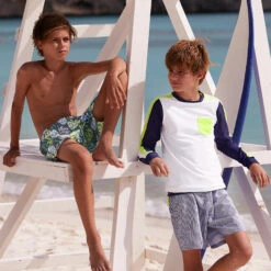 Cool, khaki green swim shorts for boys by British brand Stella McCartney Kids, with a fun gecko pattern in green and neon orange. Environmentally friendly, the silky smooth fabric is made from recycled sources with a comfortable, soft mesh lining. Come with a useful storage pouch, they have an elasticated waistband with a neon orange drawstring, two front pockets and a velcro-fastening back pocket.