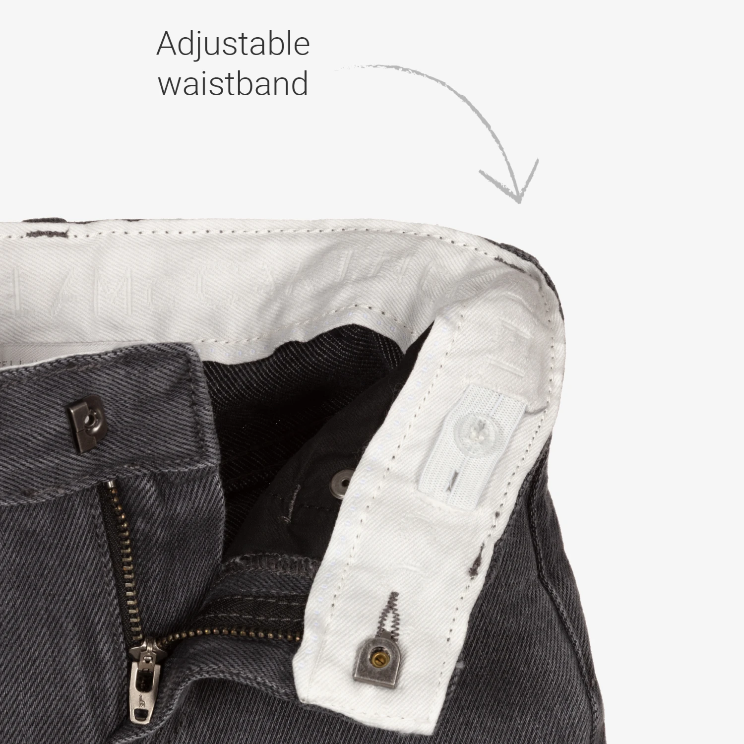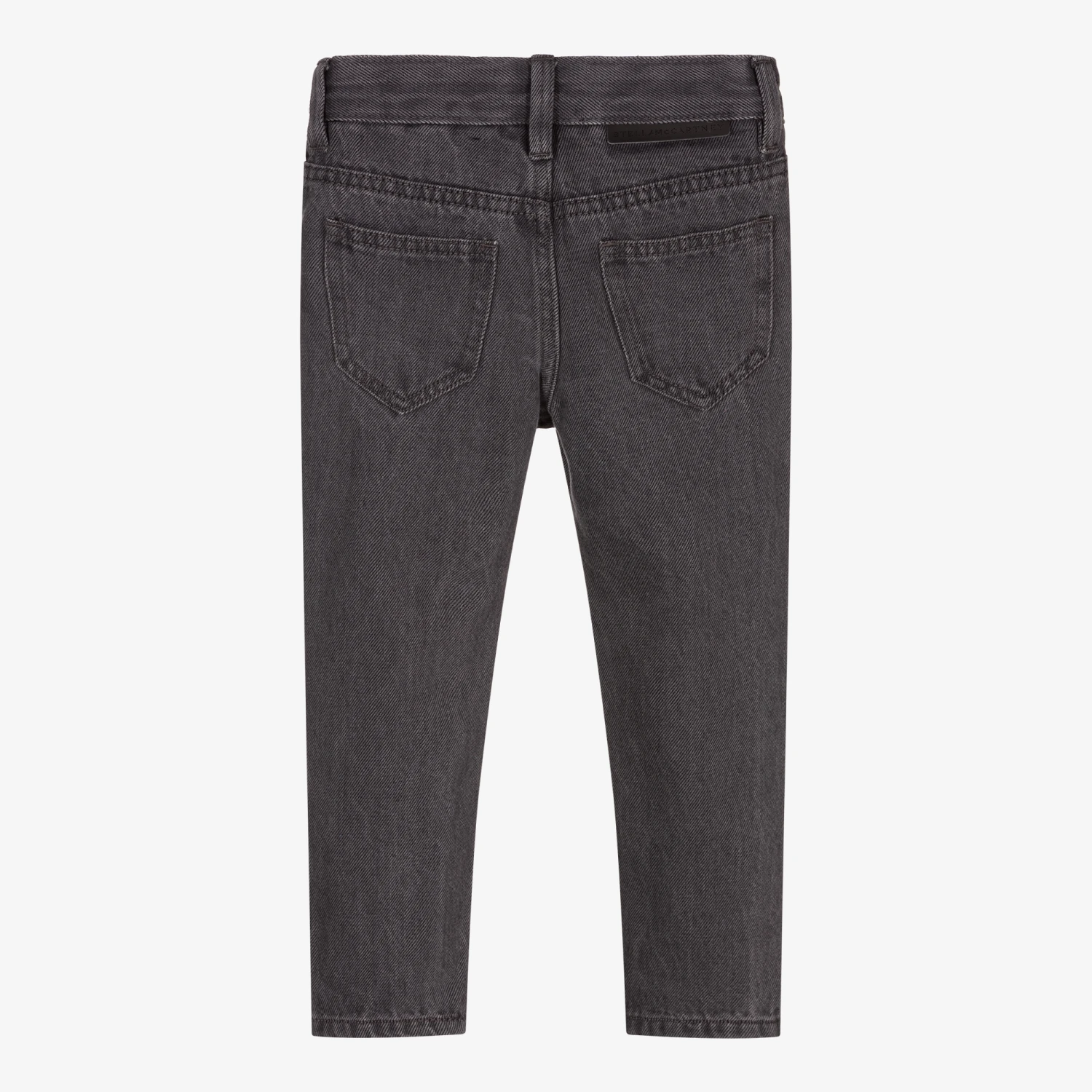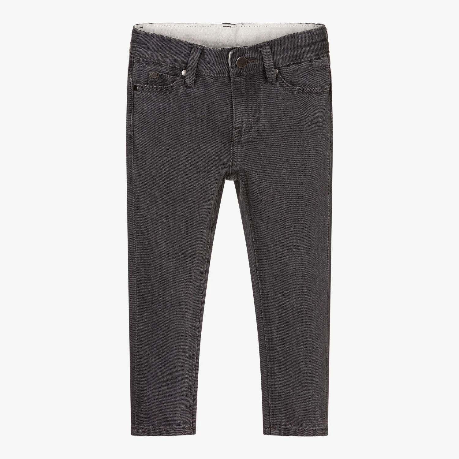 Boys slim-fit grey jeans from Stella McCartney Kids, made in non-stretch organic cotton denim. This five-pocket style has a zip and clasp fastening and logo embossed rivets. There is a black logo tab on the back of the adjustable waistband.