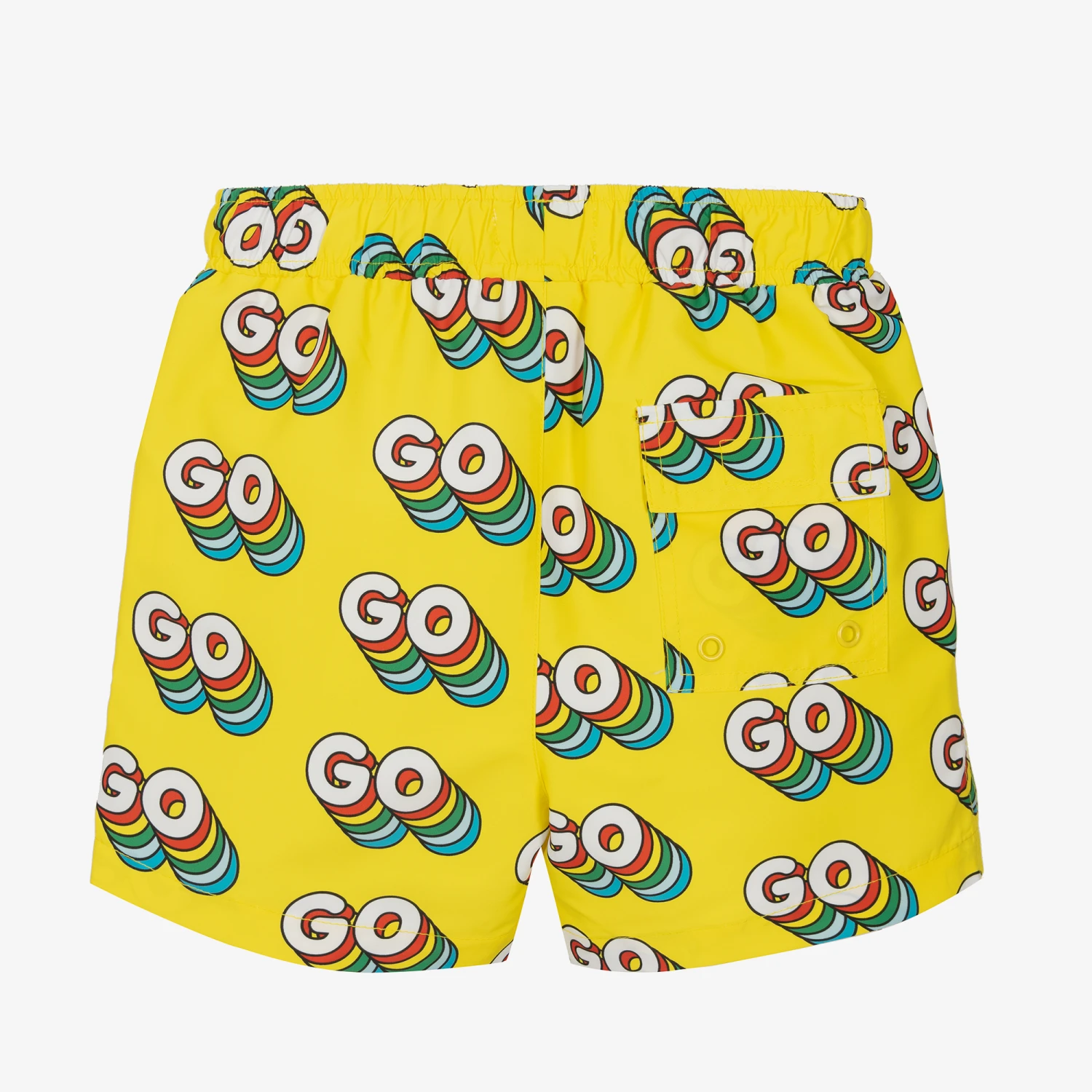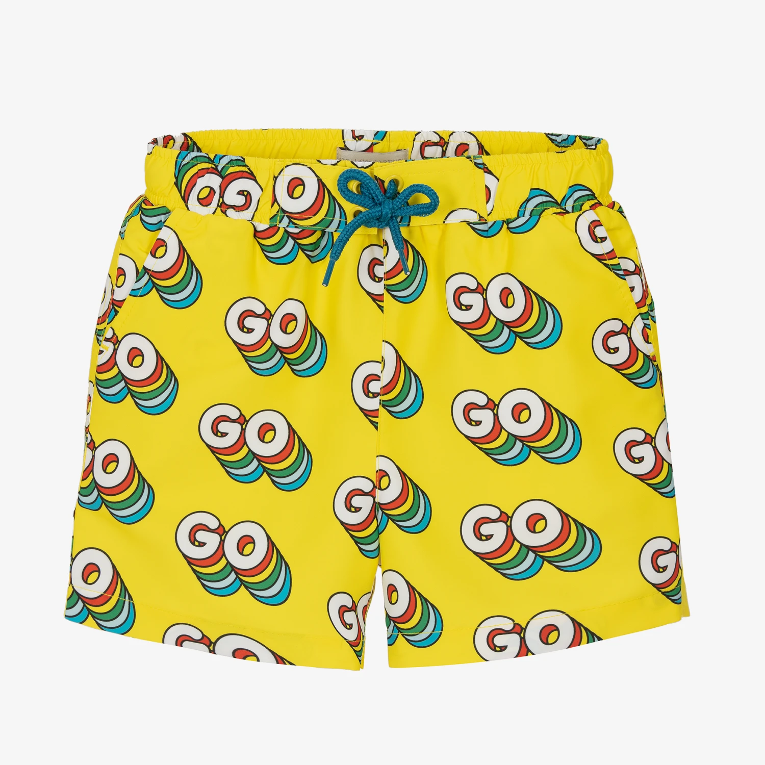 Bright yellow swim shorts for boys by British brand Stella McCartney Kids, with ‘GO’ printed in rainbow-coloured lettering. Silky smooth and vibrant, they are made from recycled fabric with a soft and comfortable mesh lining. Come with a branded storage pouch, they have an elasticated waistband with a blue tie string, two pockets on the front and a velcro-fastening back pocket.