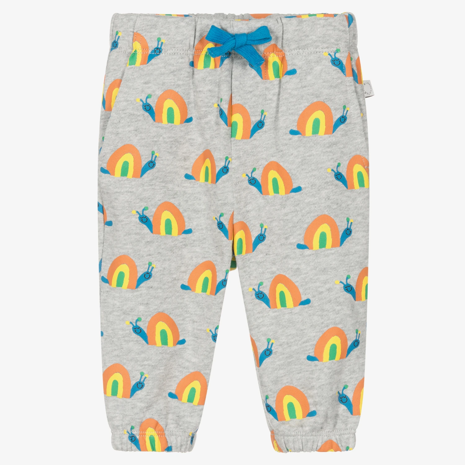 Grey marl cuffed joggers for little boys and girls by Stella McCartney Kids, patterned with a fun, colourful snail design. Ideal for relaxed days, they are made in a soft organic cotton with a fleecy underside. Gentle against little tummies, they have a gently elasticated waistband with a functional, blue drawstring tie for an adjustable fit. They have two front pockets and there is a small branded tab on the side seam for a subtle designer touch. The Stella McCartney fit can be quite small so choose a size up if you want room to grow.