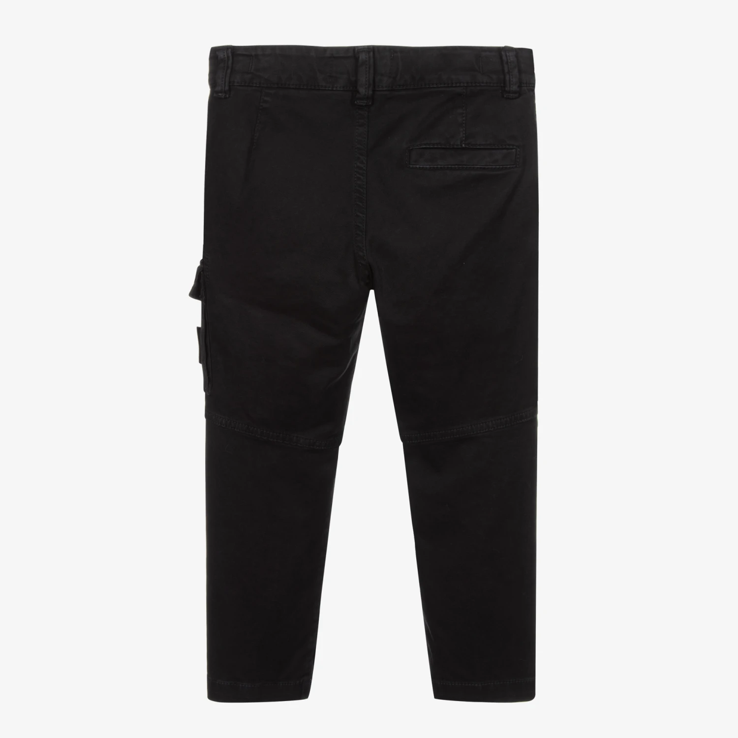 Boys black utility trousers by Stone Island Junior, mid-weight cotton twill. They have an adjustable waist and a zip and button fastening. There is a removable black compass logo badge, as well as zip-fastening side pockets and utility-style leg pockets with popper closures.