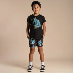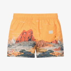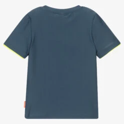 Green polo shirt for boys by British swimwear brand Sunuva. Made in stretchy, sun protective piqué, it is ideal for wearing by the beach or pool. On the front it has button fastenings and a faux pocket, with a neon orange logo tab on one side seam.