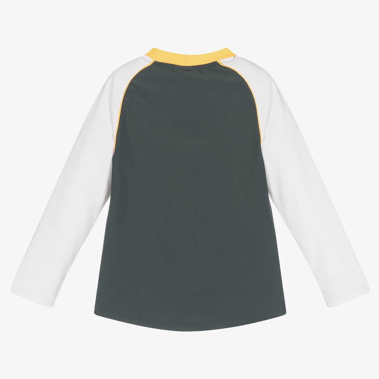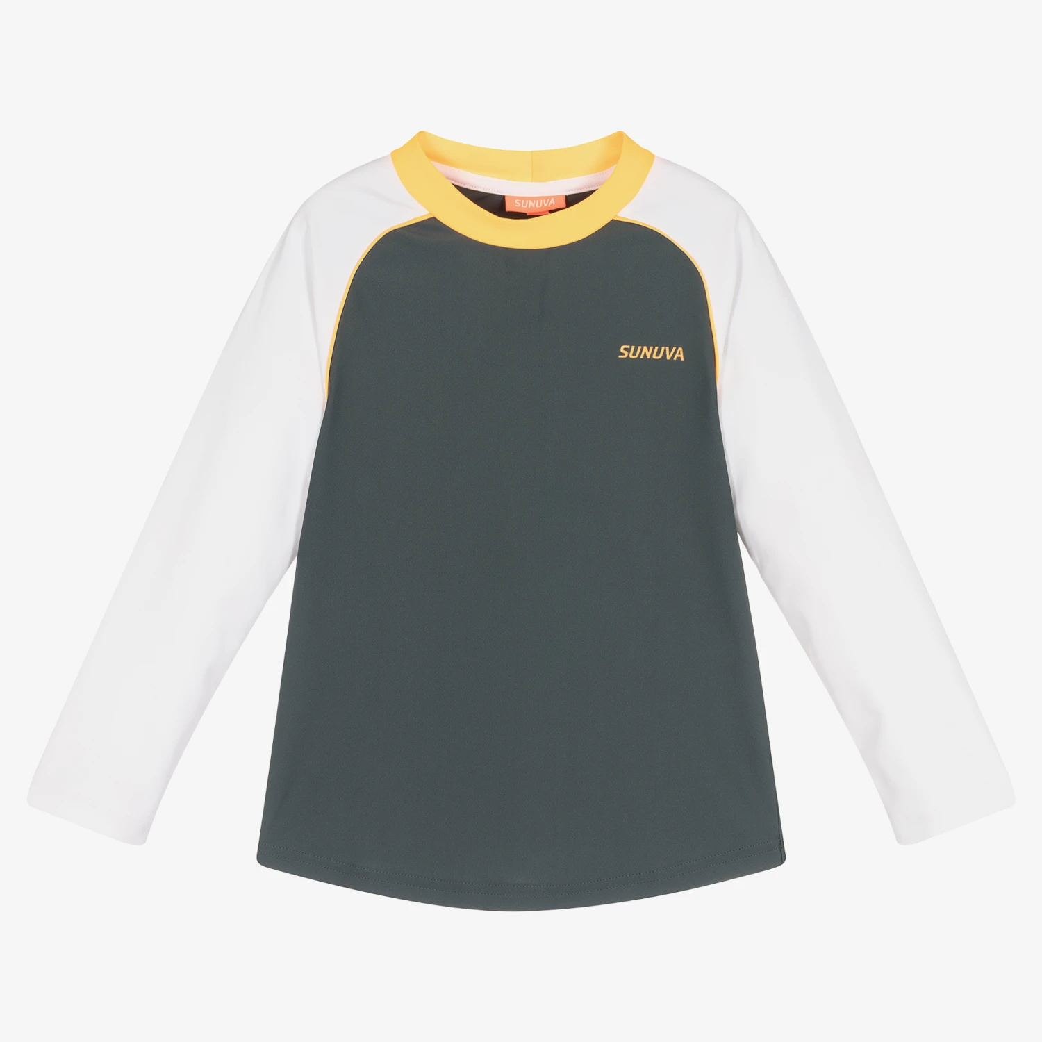 Grey and white swim top for little boys by British brand Sunuva, made in smooth and stretchy fabric with UPF 50+. Suitable for swimming, this long-sleeved top has a logo print on the chest and neon orange trims for high visibility. The raglan sleeves are great for coverage in the sun and create a sporty look.