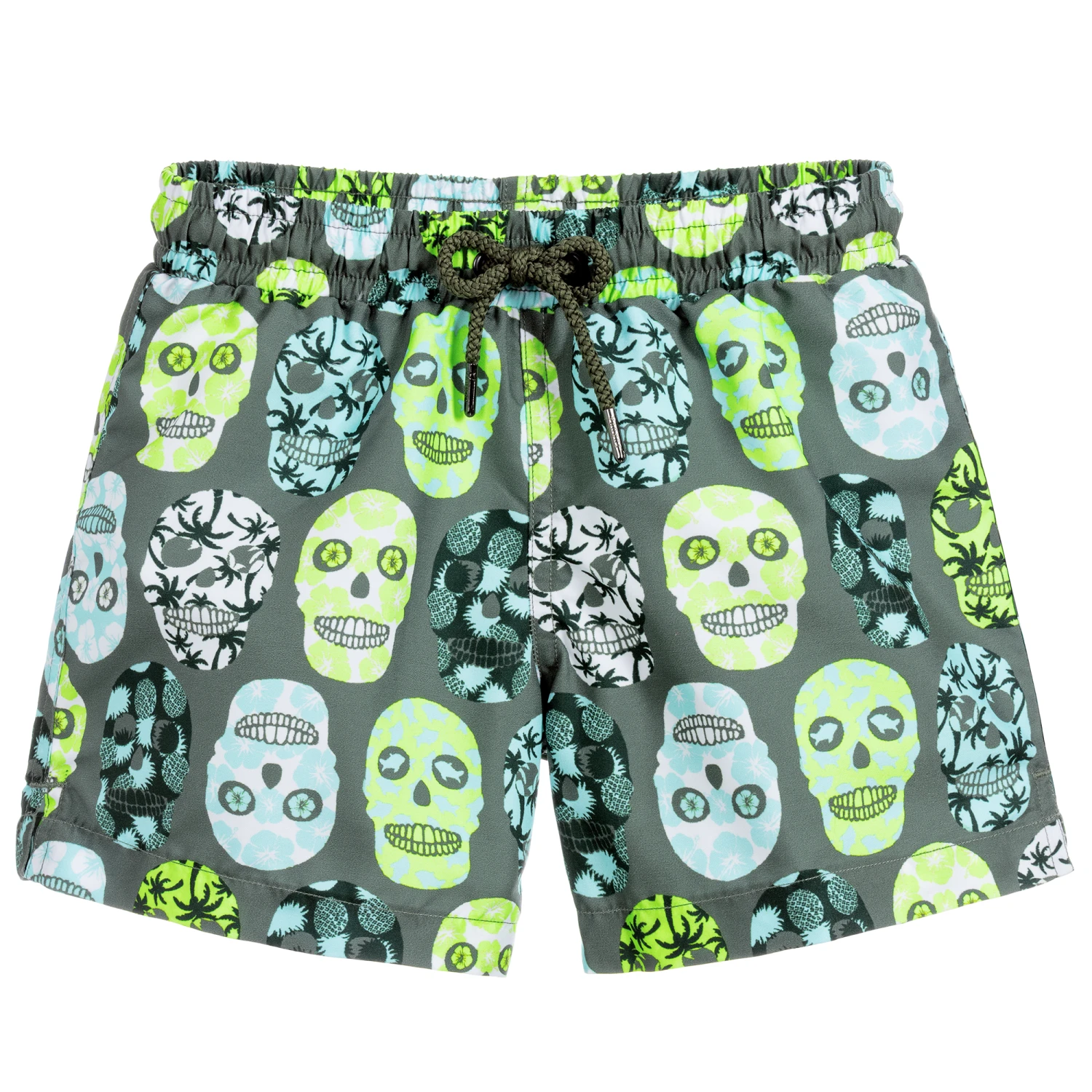 Khaki green swim shorts for boys by Sunuva, with UPF50+ sun protection. Patterned with skulls in neon yellow, blue and green, they have a soft mesh lining and an elasticated drawstring waist.