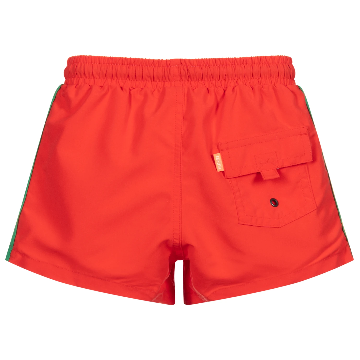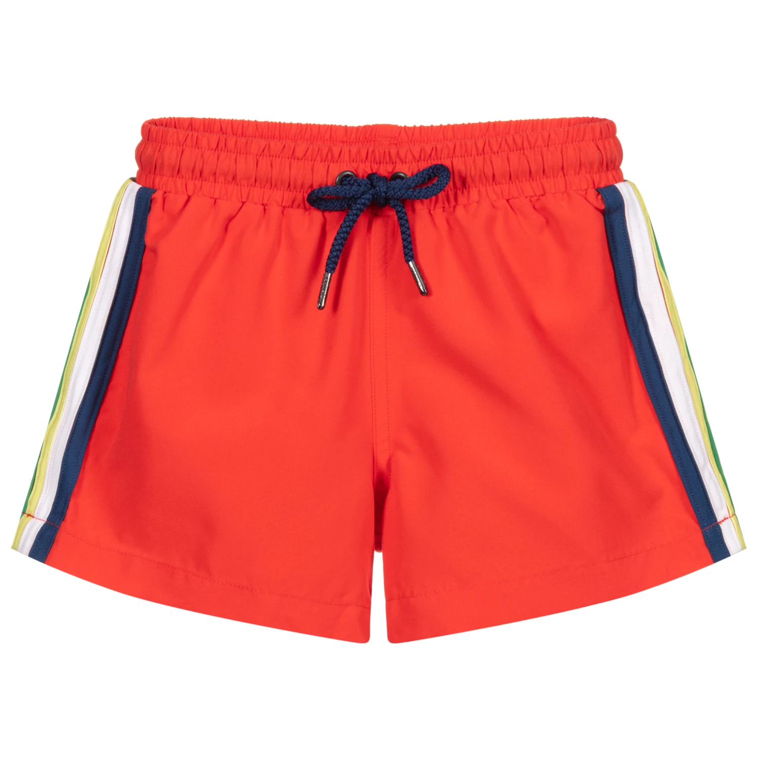 Boys red swim shorts from Sunuva, with UPF50+ sun protection. They have retro stripes down the sides in blue, white, yellow and green, and a soft mesh lining. The elasticated waistband has a drawstring tie and the shorts have a velcro-fastening back pocket.