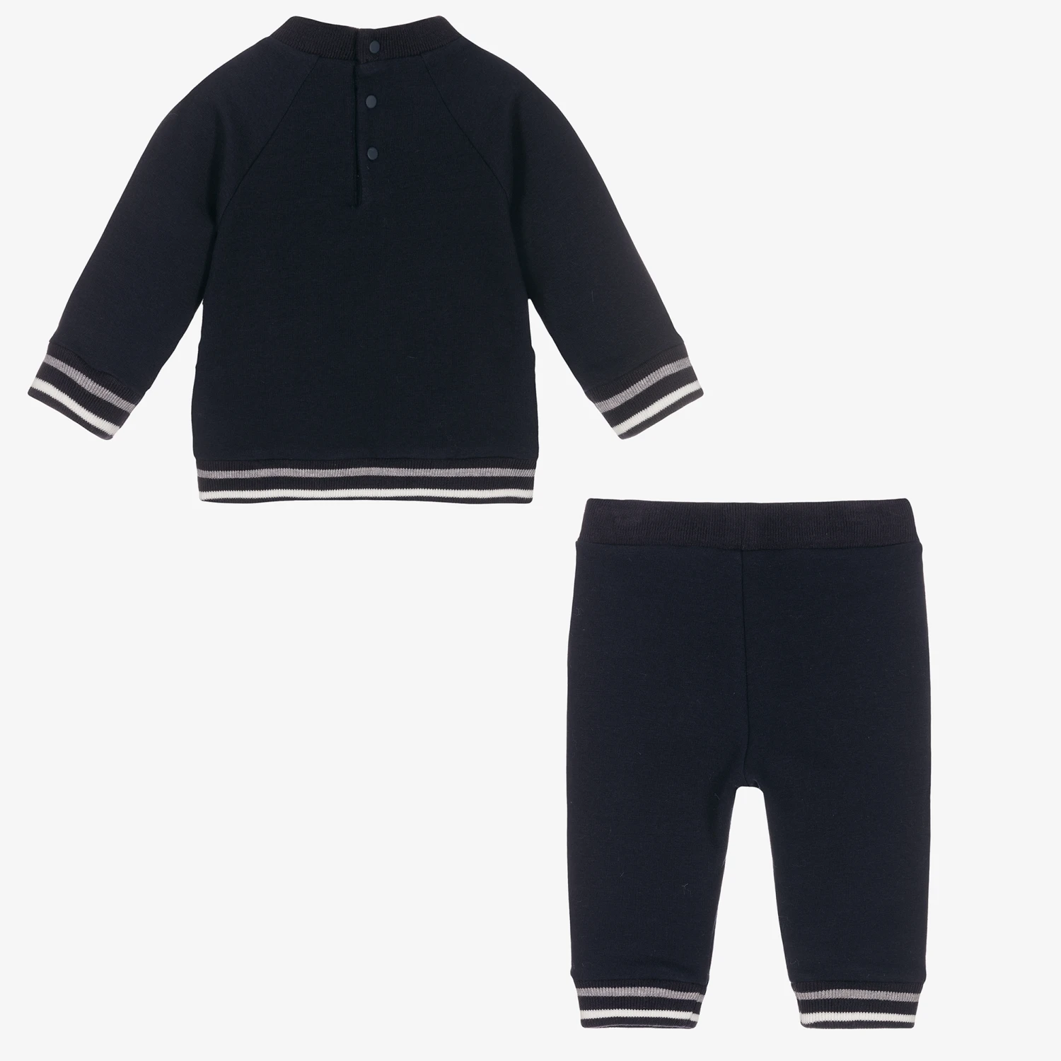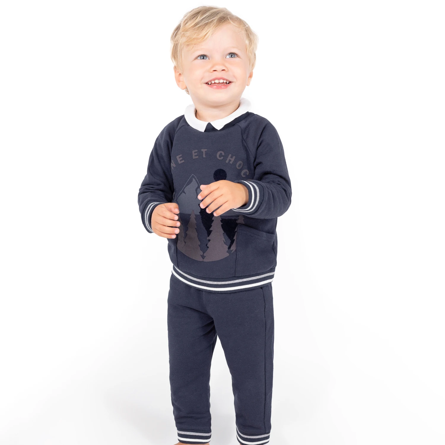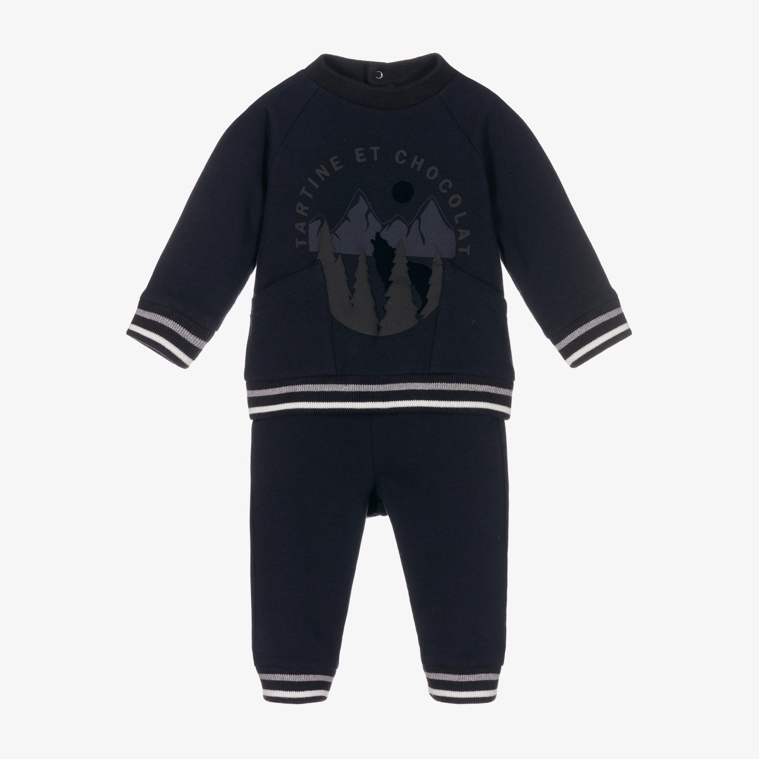 Navy blue tracksuit for little boys by Tartine et Chocolat, made in soft cotton jersey with a fleecy feel inside. The sweatshirt has a grey and blue mountain logo print with a flocked wolf and moon, and little front pockets. The joggers have side pockets and an elasticated waistband for easy pull on. Both pieces have striped, ribbed trims.
