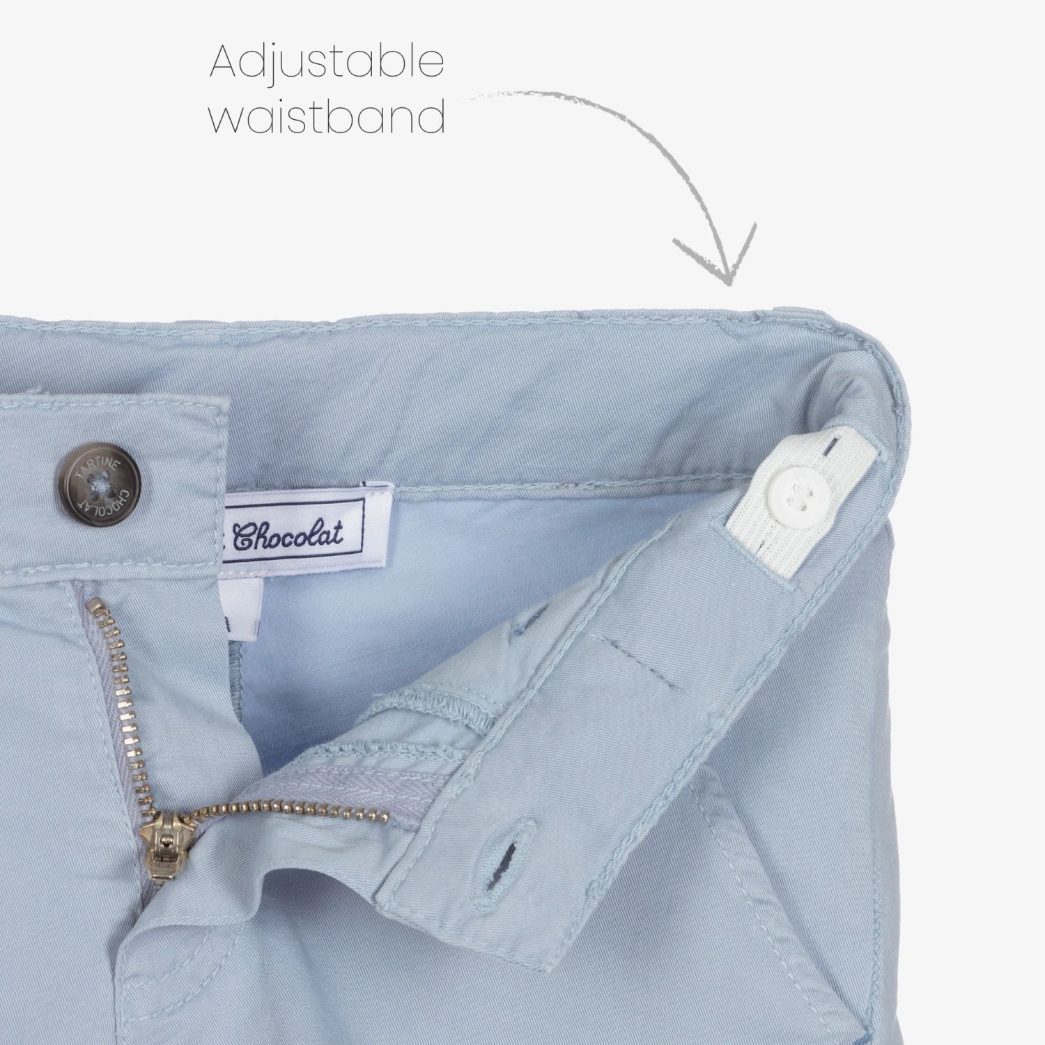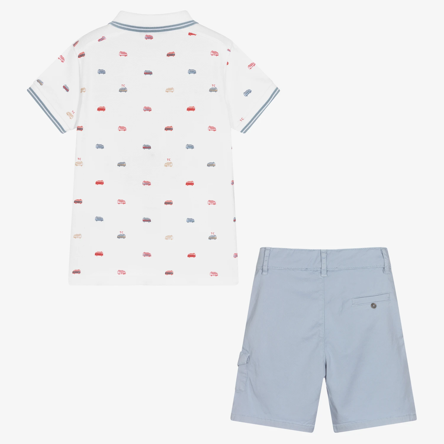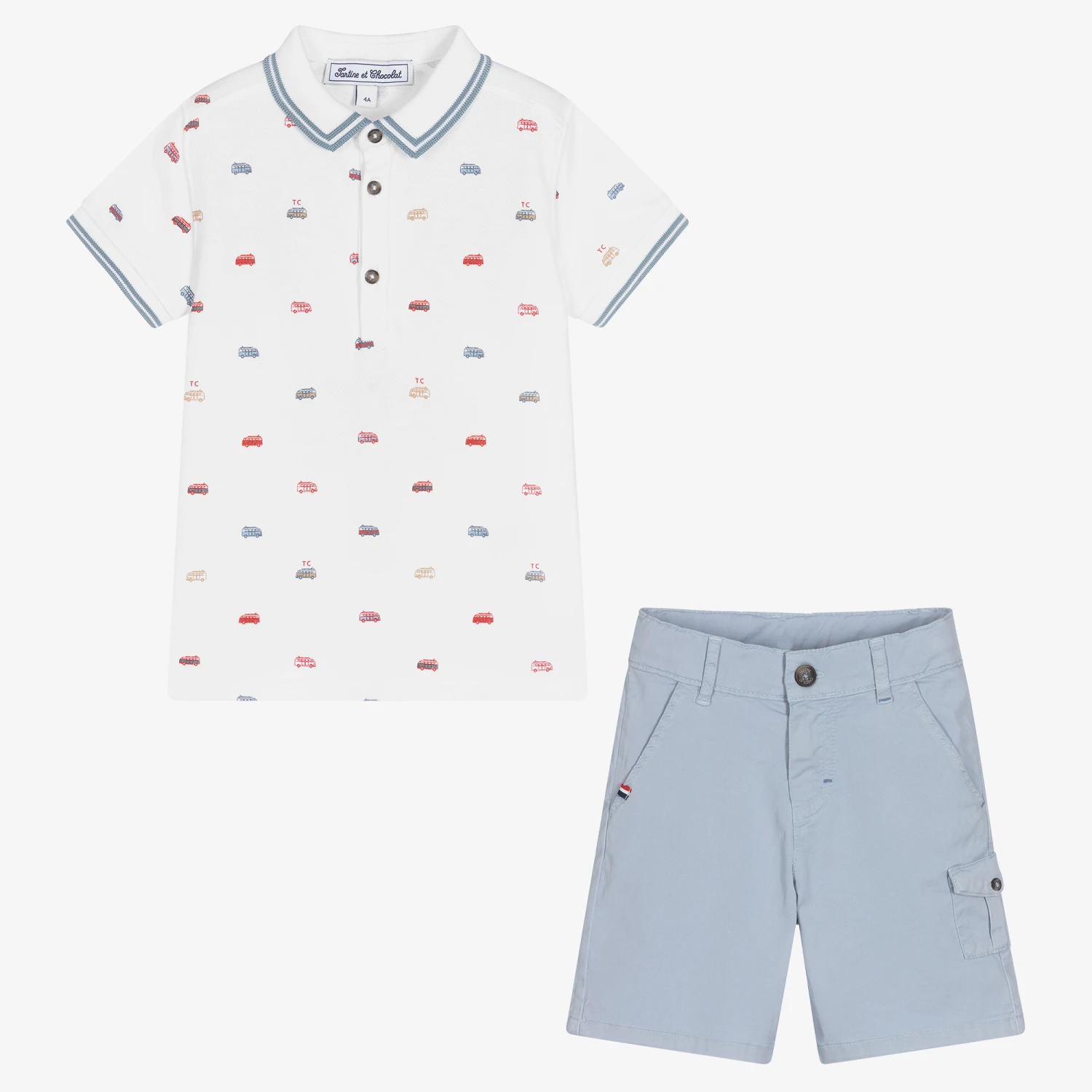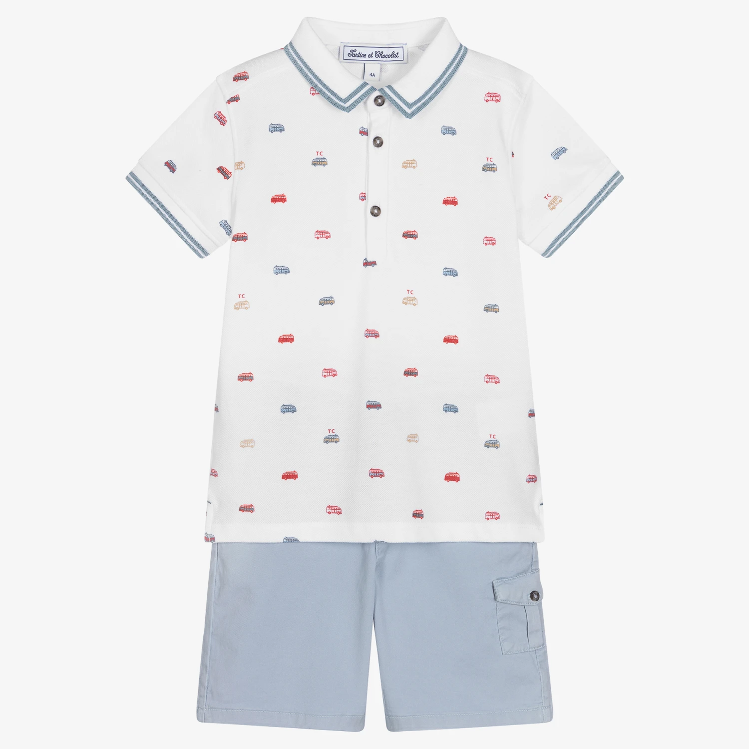 Boys white and blue shorts set from Tartine et Chocolat. The polo shirt is made in soft cotton piqué, with a colourful bus pattern. It has blue stripes on the ribbed trims and buttons on the front to fasten. The blue Bermuda cotton shorts have three pockets and a faux pocket on the back. They fasten with a zip and button on the front and have an adjustable waistband.