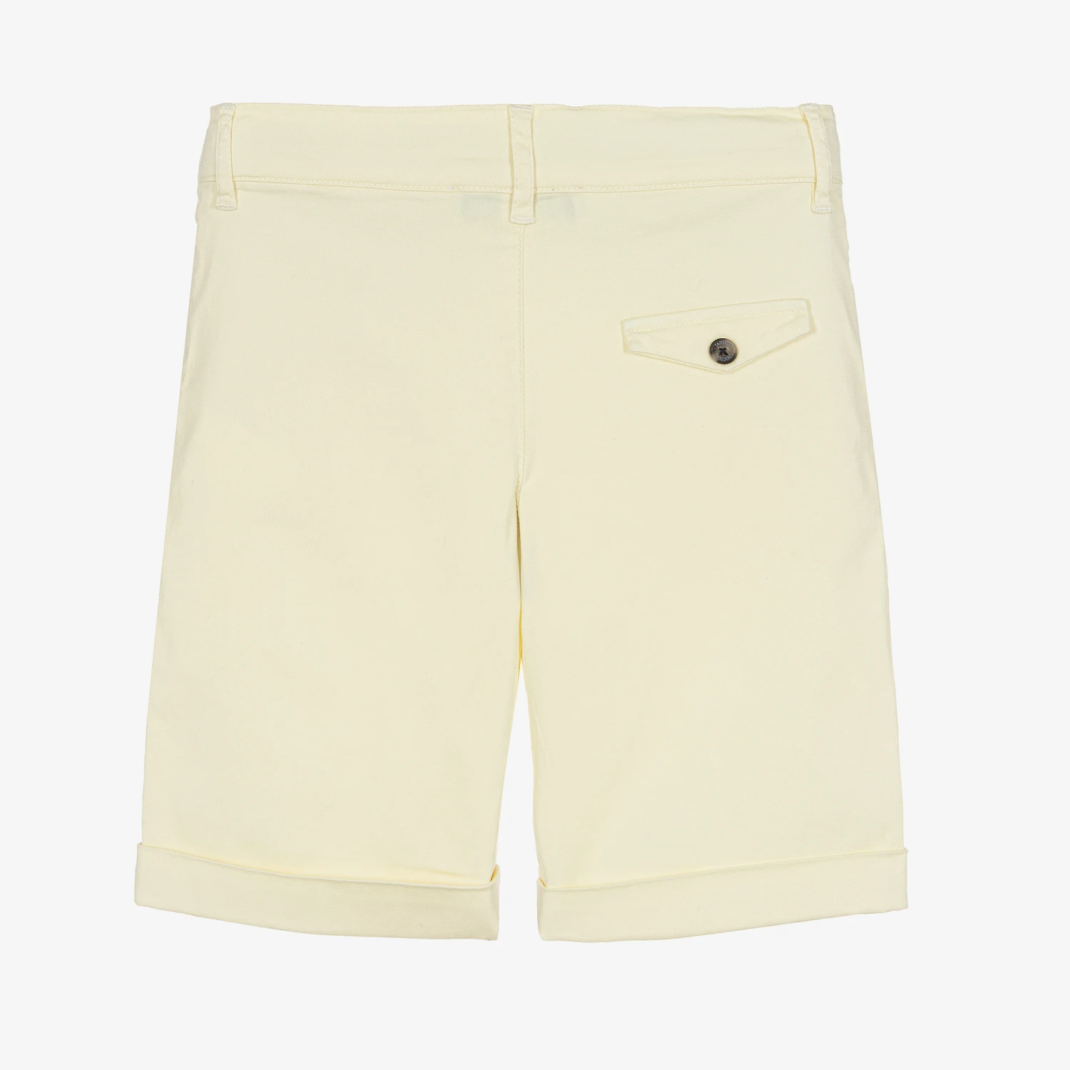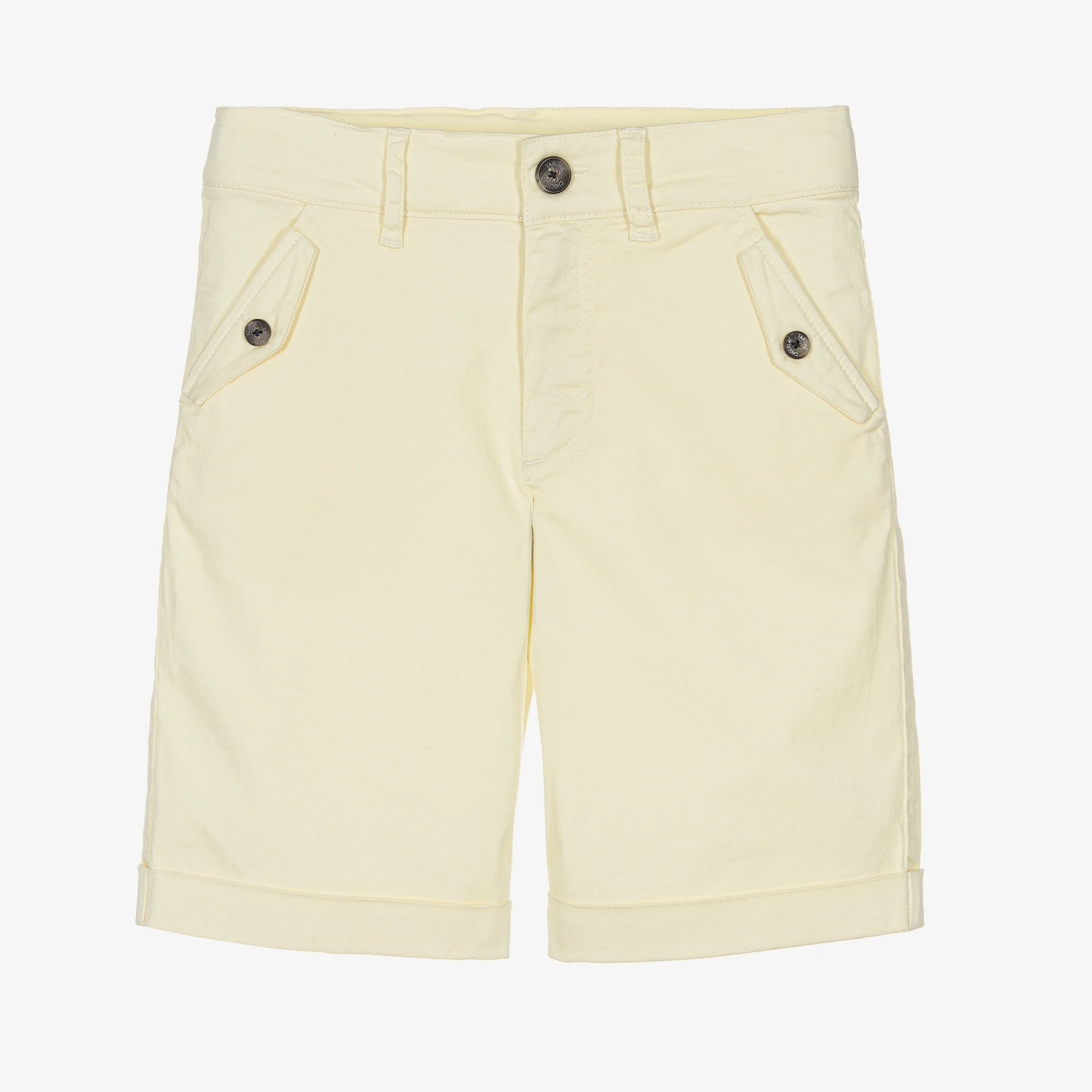 Pale yellow chino style shorts for boys by Tartine et Chocolat, made in lightweight cotton twill. They have slanted front pockets, with button trims and a faux back pocket. Casual, yet stylish, they have a zip and button fastening and a useful adjustable waist.