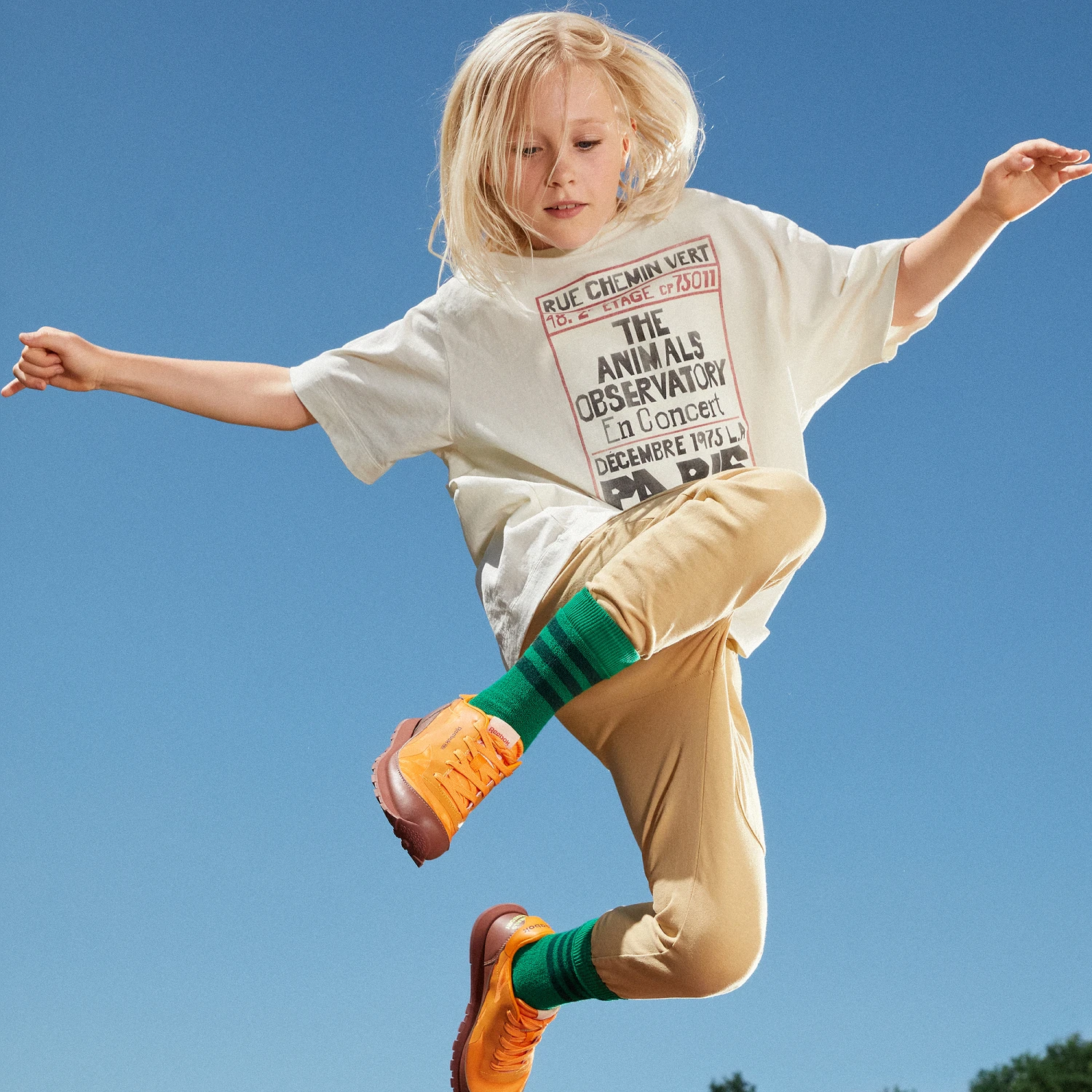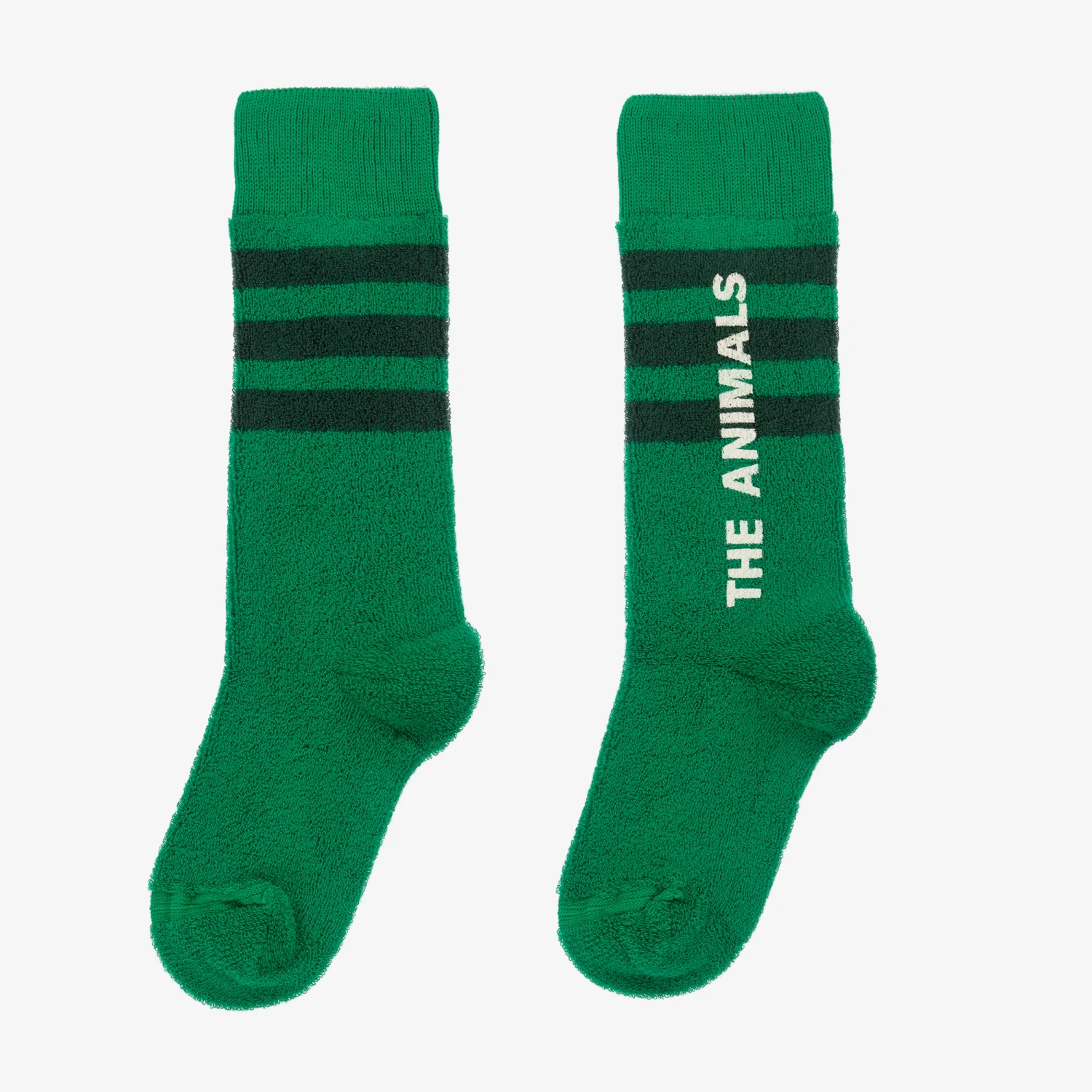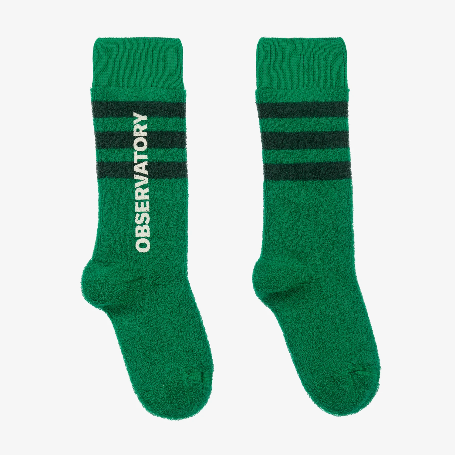 Fun green socks for boys and girls by The Animals Observatory. Made in super soft and stretchy cotton terry, these cosy socks have dark green stripes and the brand name printed in white on the sides. Comfortable to wear and ideal for keeping warm, they have soft ribbed cuffs.