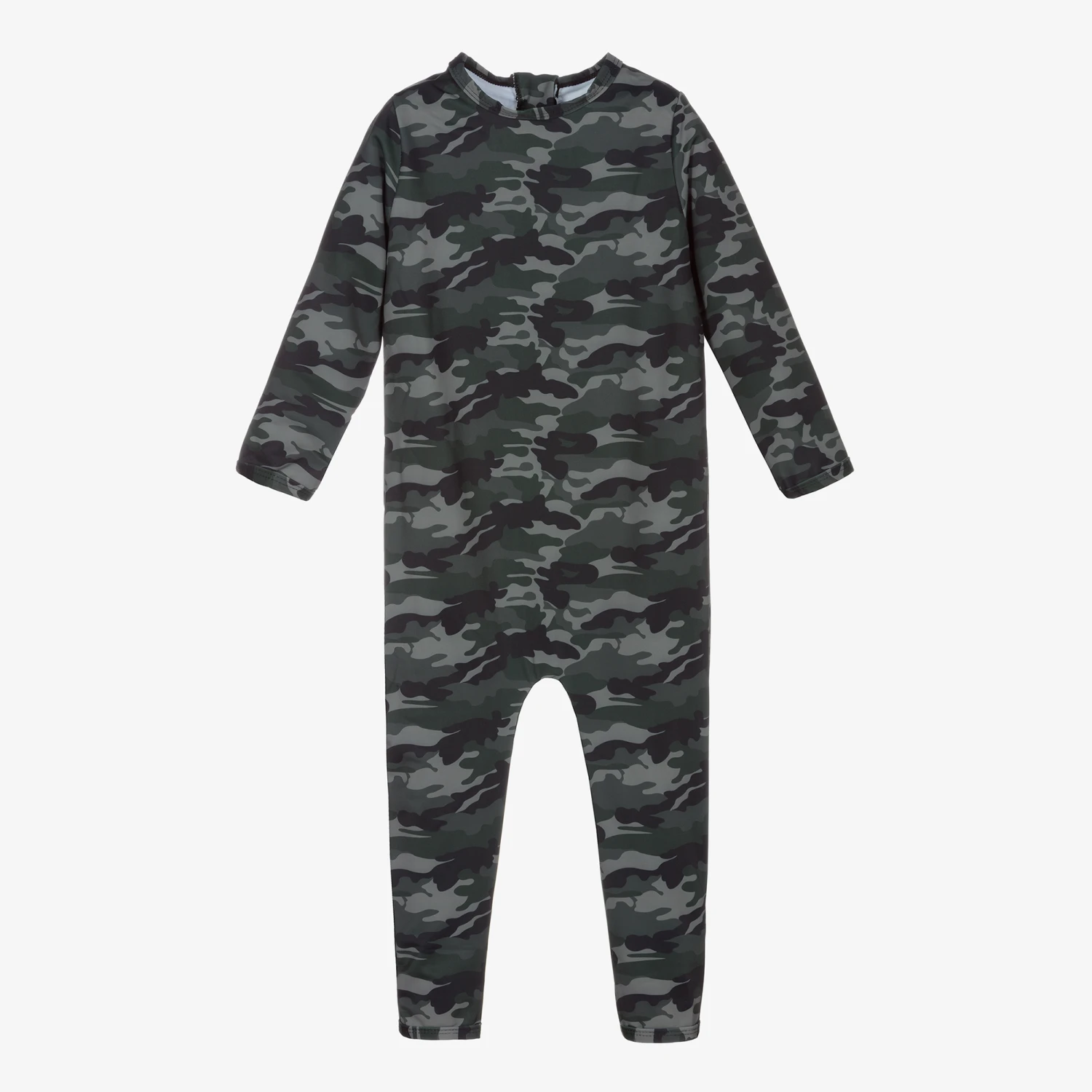 Long-sleeved sun suit for boys & girls by The Tiny Universe, in a green, black and grey camouflage print. Silky smooth and stretchy, it has UPF50+ protection, just right for swimming and playing in the sun. There is a zip fastening on the back, together with the brand’s embroidered logo patch.