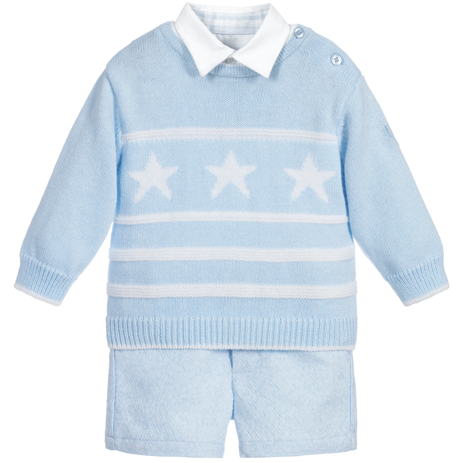 Pale blue four piece outfit for little boys by Tutto Piccolo, comprising a sweater, shirt, shorts and socks. The super soft sweater is knitted in a cotton and angora wool blend, with white stripes and stars in the weave. The white shirt has pale blue tartan trims with elbow patches and the brand’s logo embroidered on the front. The shorts have a useful adjustable waistband and they come with mid-length socks.
