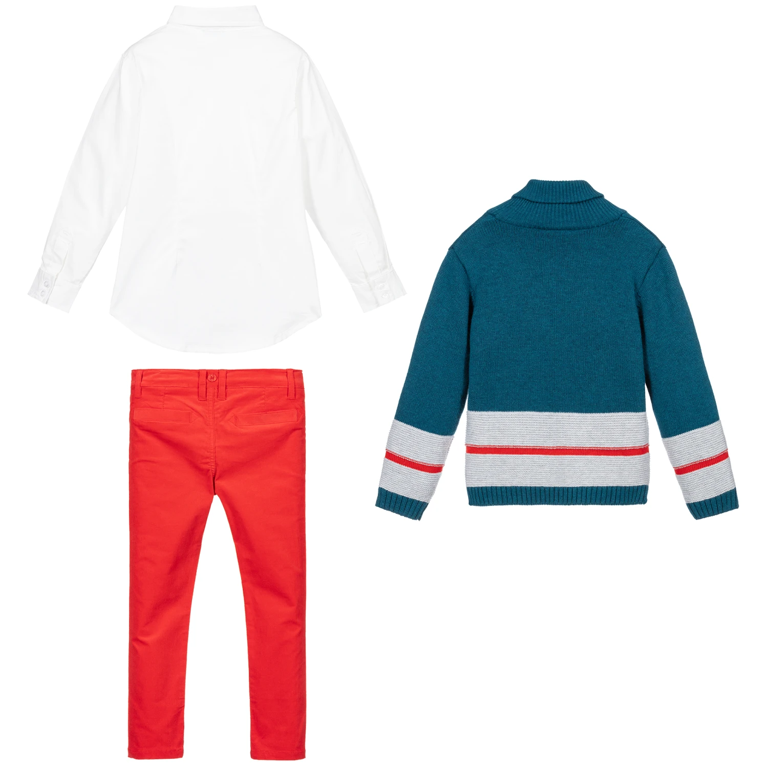 Shirt, sweater and trousers set by Tutto Piccolo. The white cotton shirt has the brand’s embroidered logo on one side. The red trousers are made in fine corduroy and have a useful adjustable waistband. The teal green sweater is knitted in cotton and has grey and red stripes, an embroidered logo and a shawl collar.
