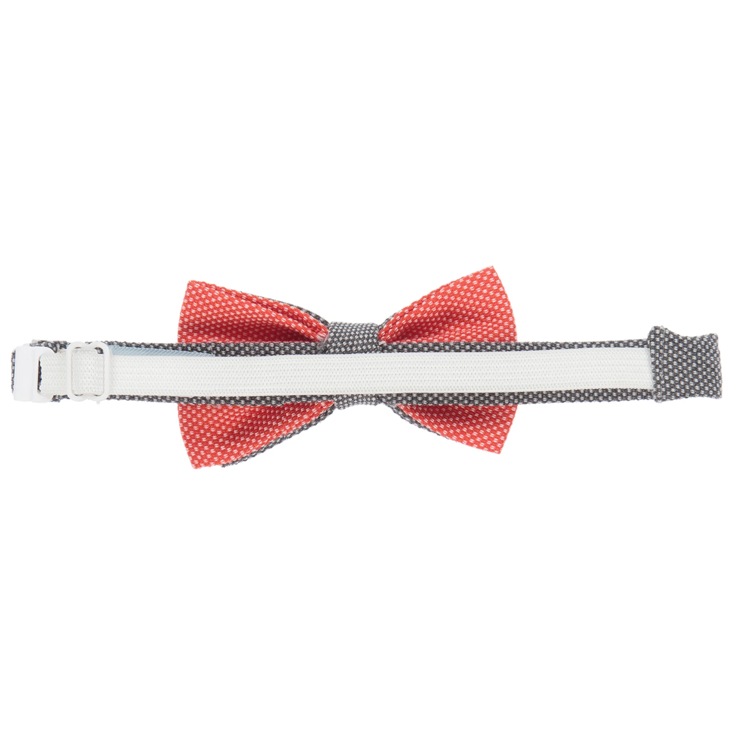 Grey bow tie for boys by Tutto Piccolo. Made in a viscose blend, it has ivory spots within the weave and a matching red bow behind. It has an adjustable, elasticated back for a good fit.