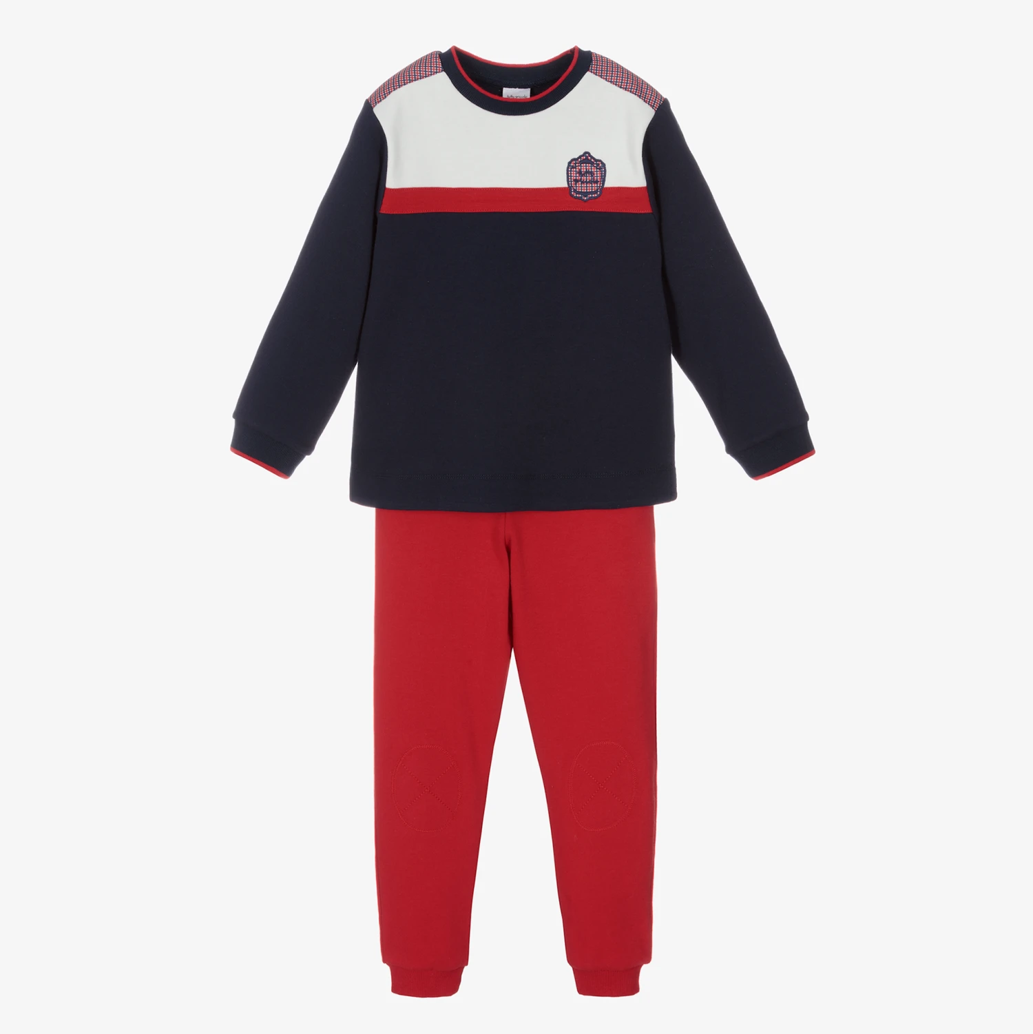 Navy blue and red tracksuit for boys by Tutto Piccolo, made in soft cotton jersey. The navy blue top has red, white and blue checked trims and shoulder patches with a matching logo badge on the chest. The red joggers have slanted front pockets, reinforced knees and a faux drawstring on the elasticated waistband.