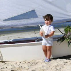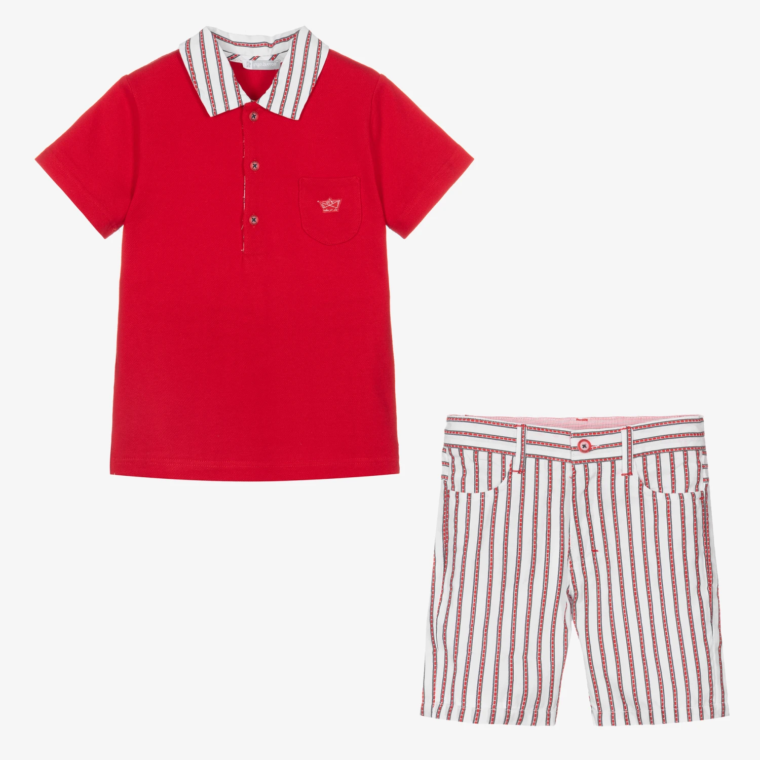 Cute red shorts set for boys by Tutto Piccolo. Made in soft cotton piqué, the red polo shirt has a sweet chest pocket with a logo appliqué, and a red and white striped collar. It pairs with matching white and red striped shorts with an adjustable waist, to complete the smart-casual look.