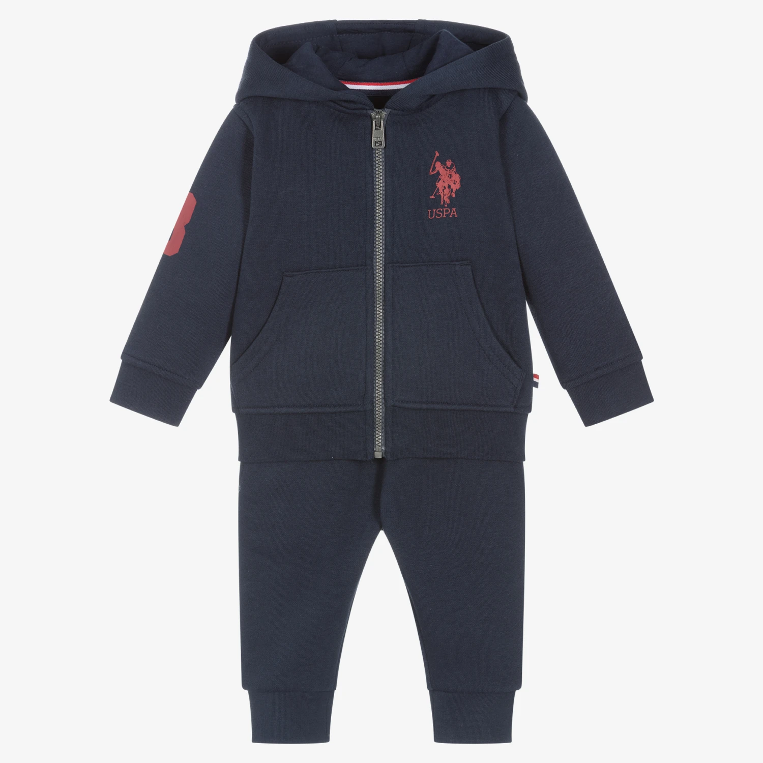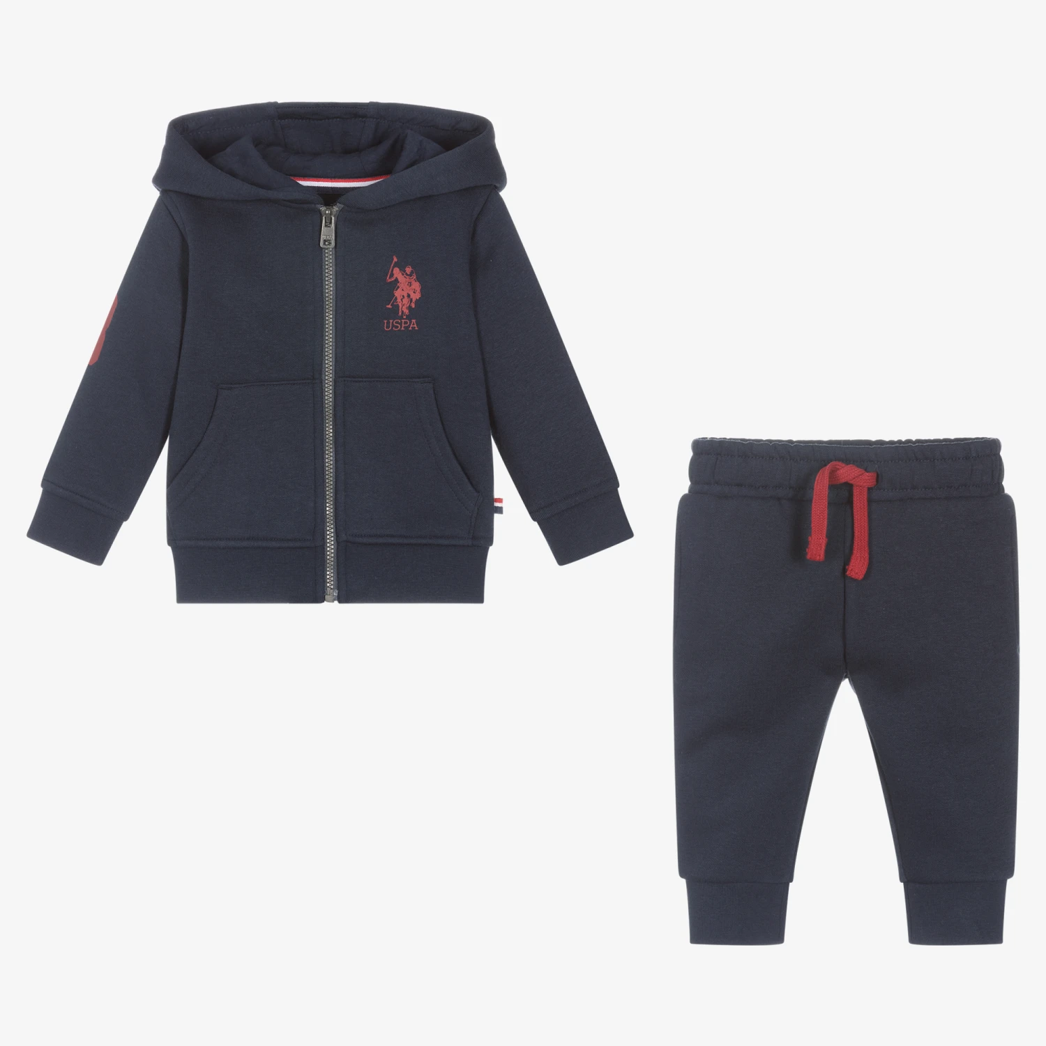 Casual and comfy for little boys, this navy blue hooded tracksuit is by U.S. Polo Assn.. It is made in soft cotton-blend jersey and has a warm fleecy inside. The zip-up top has the brand’s signature double horseman logo printed on the chest, with pouch pockets on the front. The joggers have an elasticated waist with a faux drawstring, and side seam pockets.