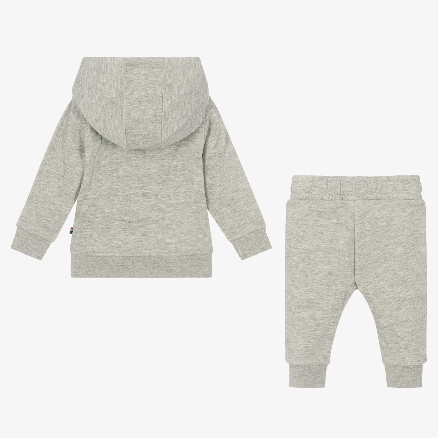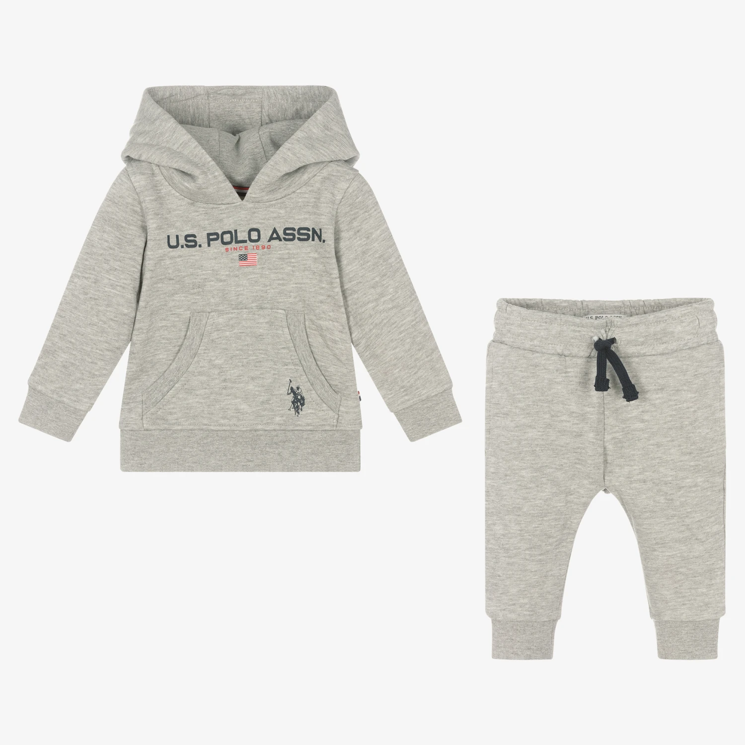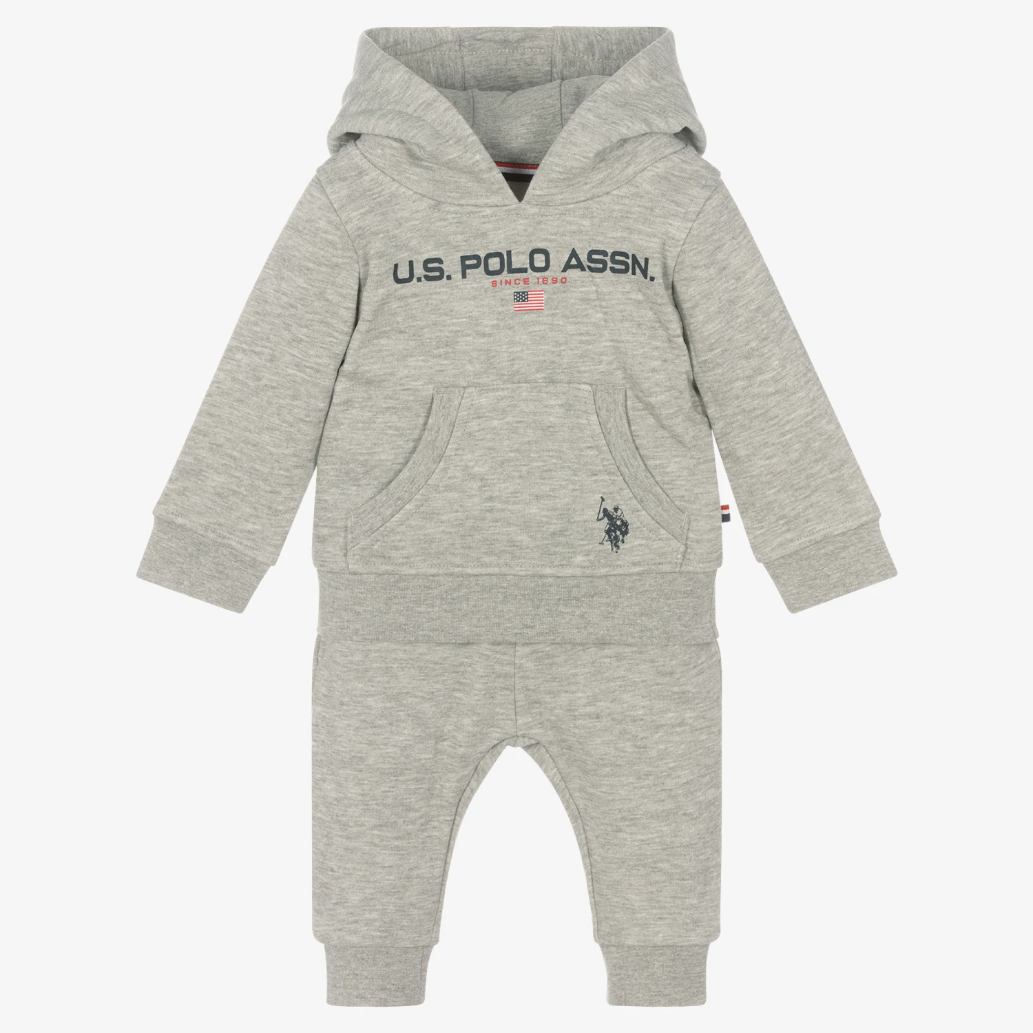 Casual and comfy for little boys, this grey marl hooded tracksuit is by U.S. Polo Assn.. It is made in soft cotton-blend jersey and has a warm fleecy inside. The top has a navy blue logo print across the front, with the brand’s signature double horseman logo on the pouch pocket. The joggers have an elasticated waist with a faux drawstring, and side seam pockets.