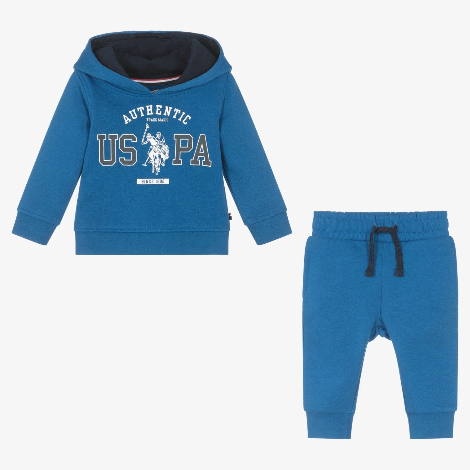 Royal blue tracksuit for younger boys U.S. Polo Assn., made in soft and stretchy cotton-blend jersey. The hoodie has has a black and white horseman logo print on the front, pockets and a navy blue hood lining. The joggers have side pockets and an elasticated waist with navy blue faux drawstrings for a comfortable fit.