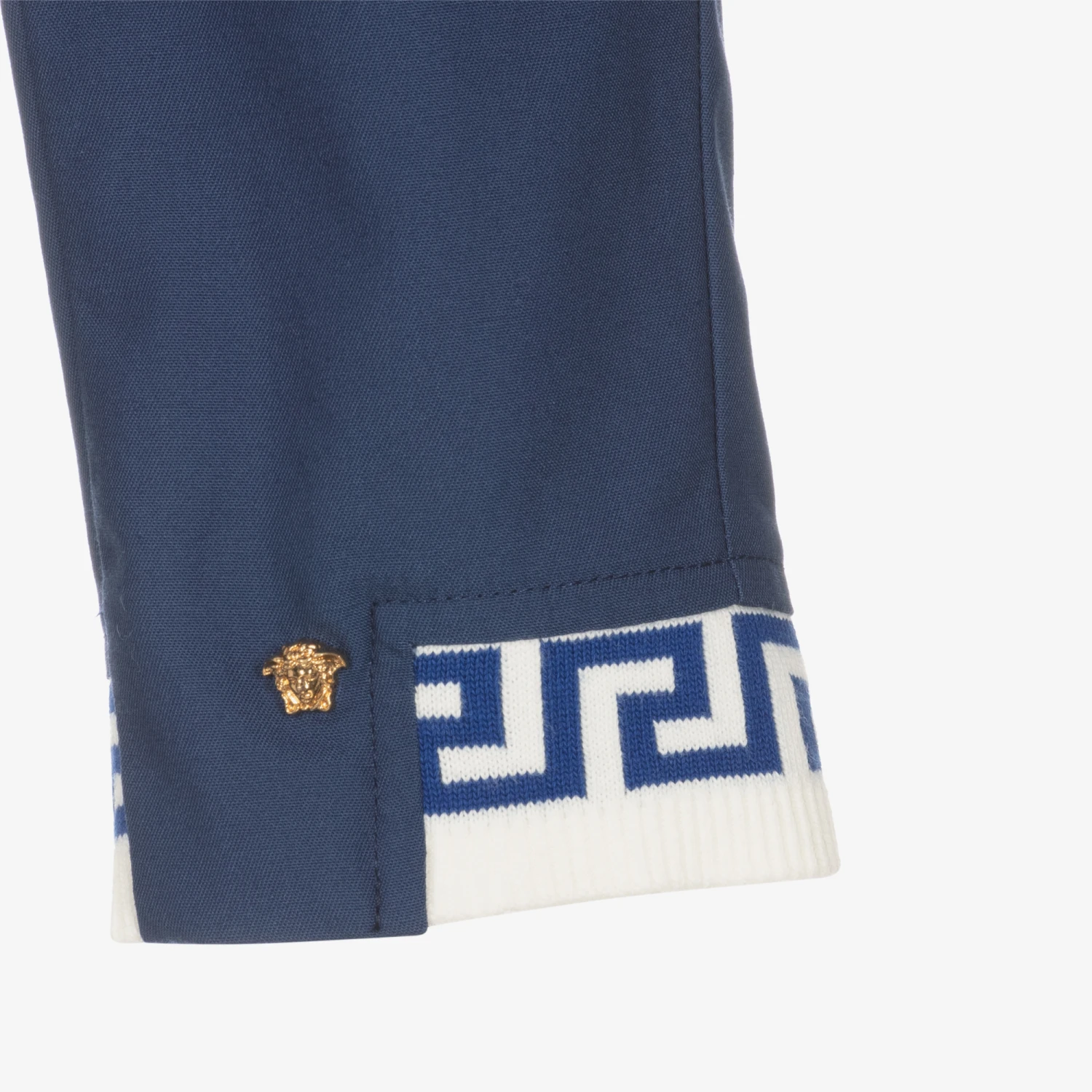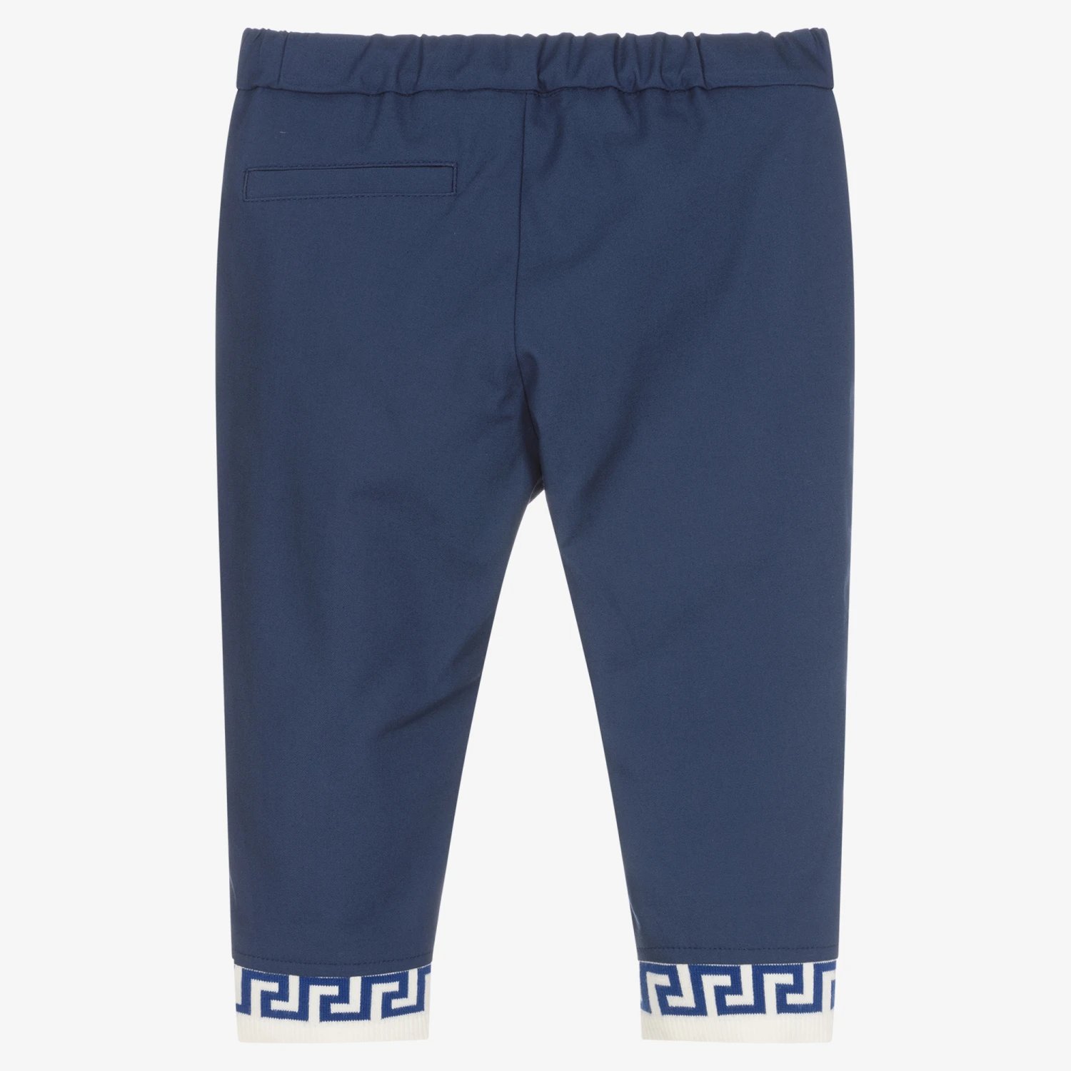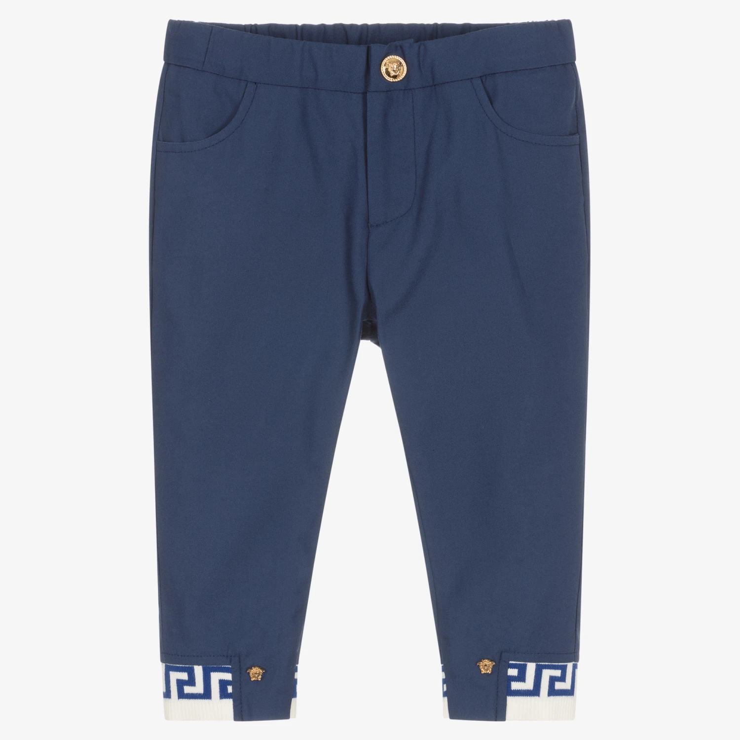 Smart casual blue cotton twill trousers for little boys by luxury Italian brand Versace. The iconic Greca motif in blue and white jacquard knit, and the little golden Medusa stud details on the cuffs make it distinctively Versace. There are two pockets on the front and a faux pocket on the back. For a fuss-free dressing, they fasten with a zip and a statement, golden Medusa popper on the gently elasticated waist.