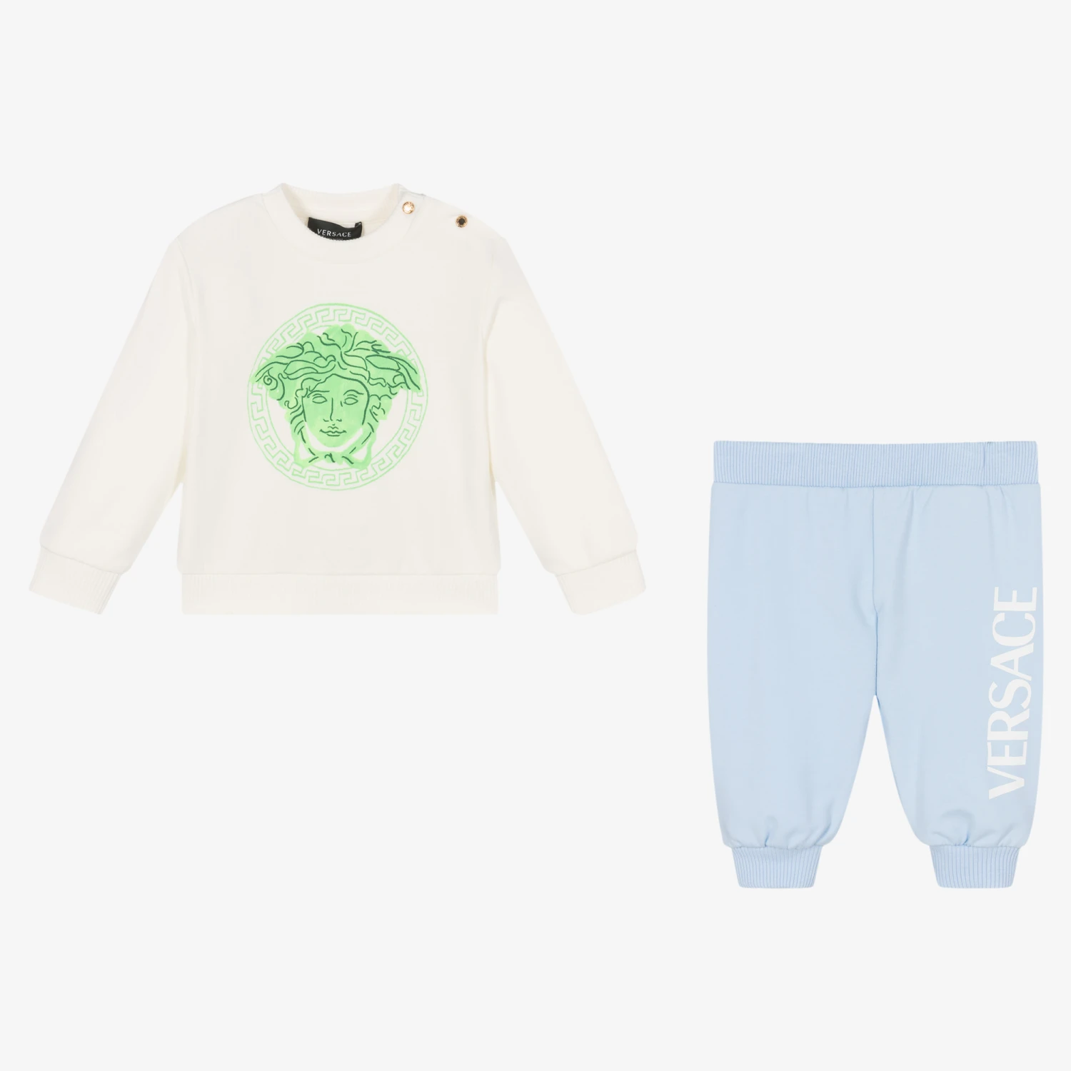 In ivory and pale blue, this cosy and comfy cotton jersey tracksuit for little boys is by luxury Italian brand Versace. The sweatshirt has the iconic Medusa logo printed in green on the front, with gold Greca-engraved popper fastenings to help with dressing. The joggers have a white logo print down one leg and a comfortable elasticated waistband.