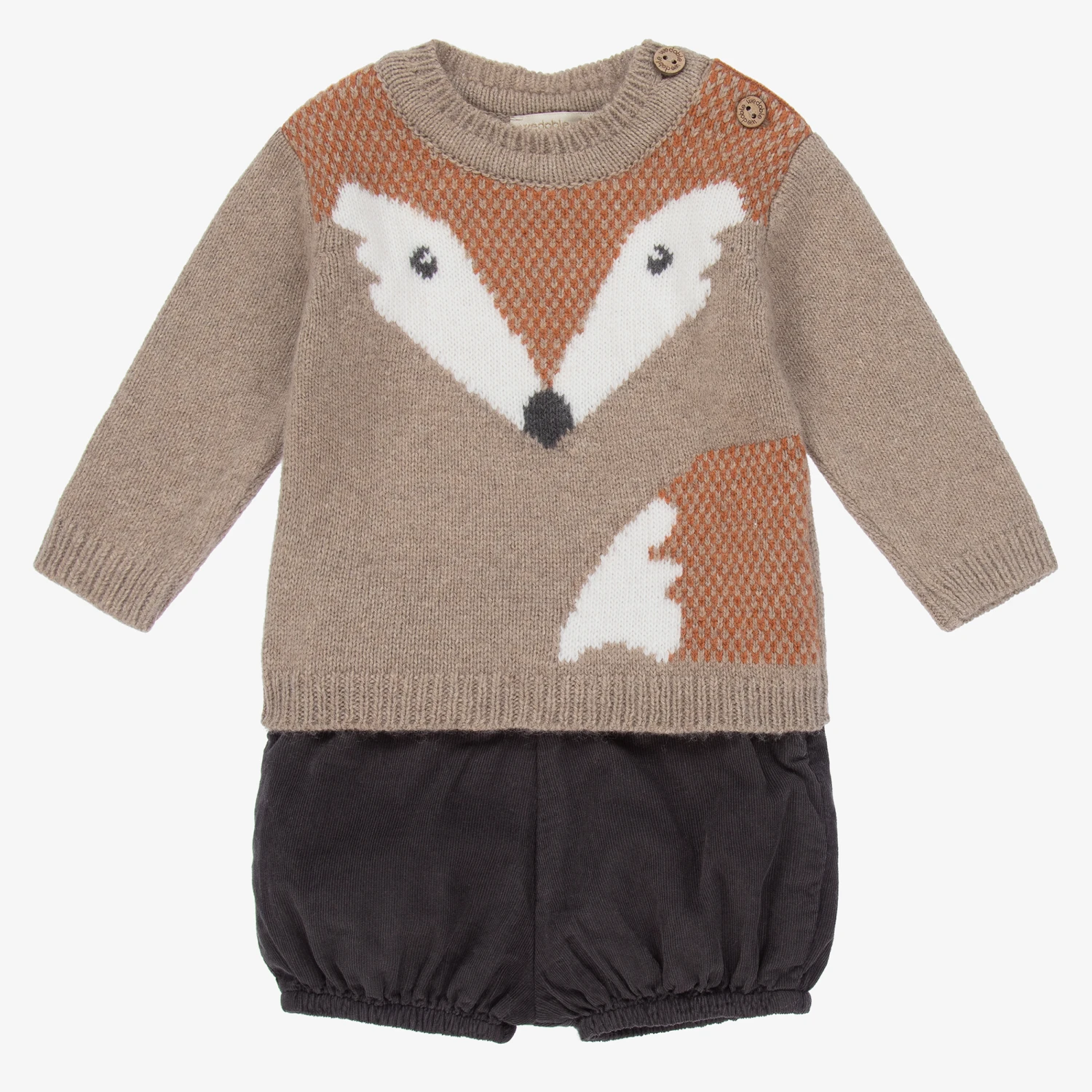 Beige and grey shorts set for little boys by Wedoble. The beige sweater is knitted in a beautifully soft cashmere and Merino wool blend and a lovely orange fox motif on the front. The grey shorts are made in soft cotton needlecord and are lined in voile cotton. They fasten with wooden buttons on the sides.