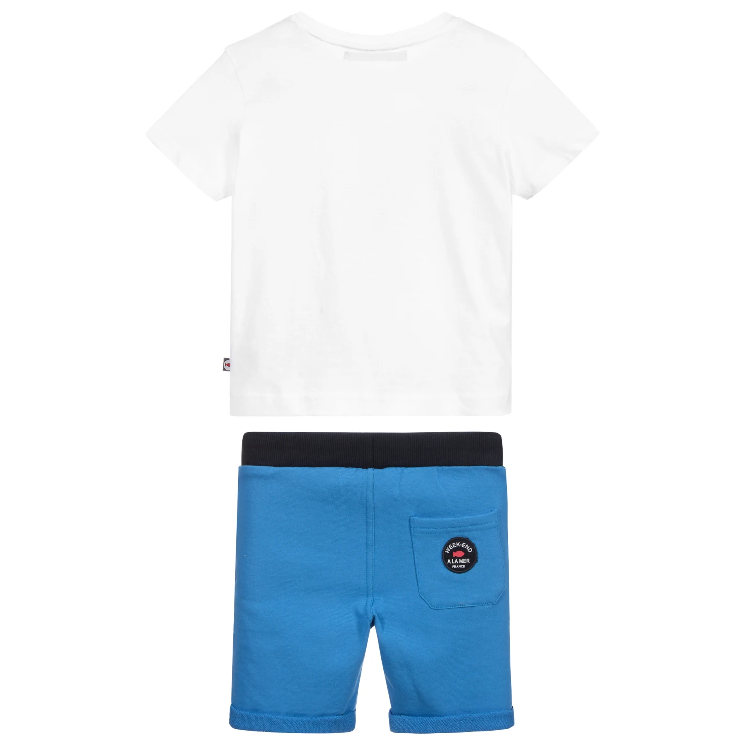 Shorts set for boys by French designer Week-end à la Mer, made in cotton jersey. The white T-shirt has a blue and yellow surf-boarding dinosaur printed on the front with the brand’s logo. The blue shorts have a useful drawstring waistband, fixed turn-ups and a navy blue logo badge on the back.
