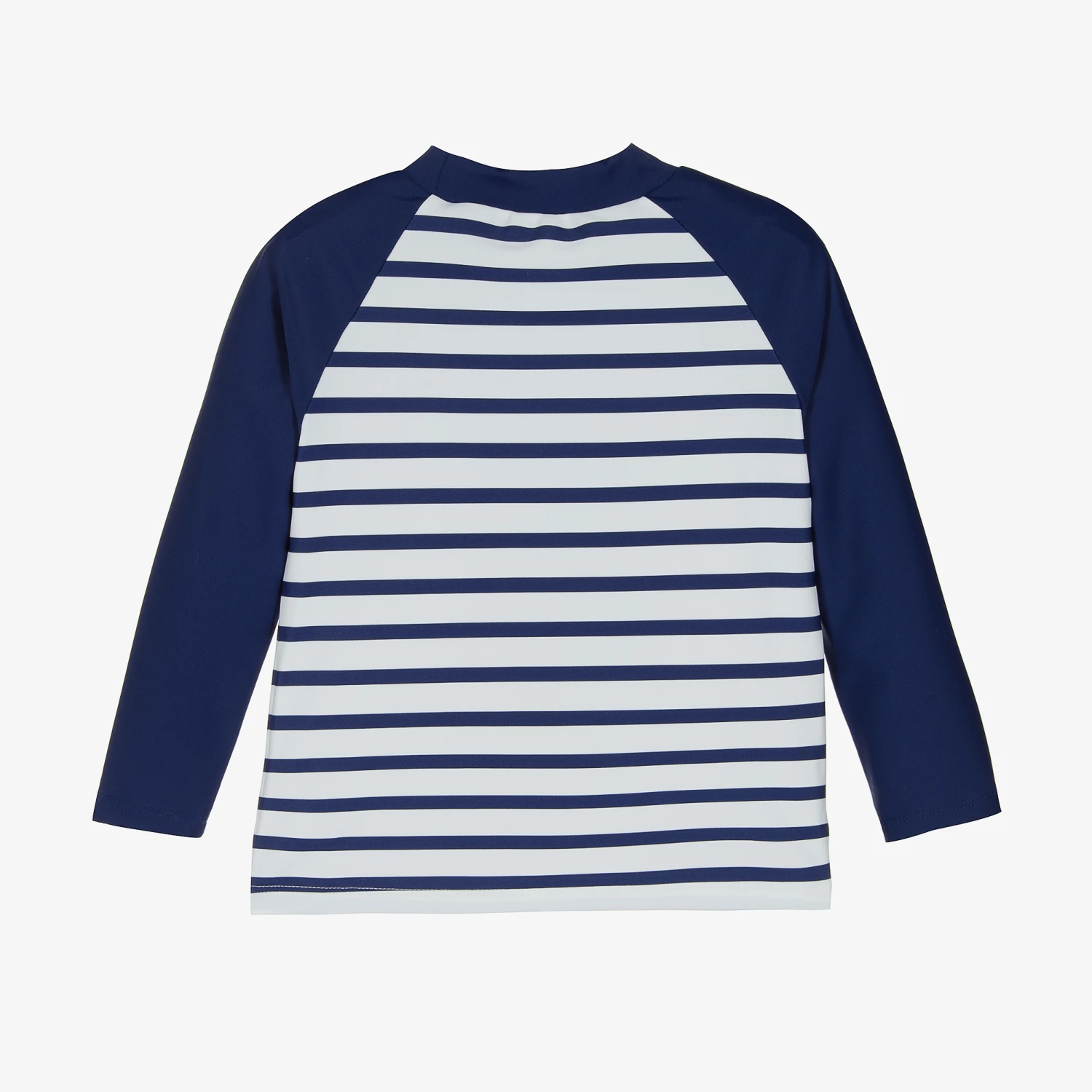 White and blue swim top for boys by French designer Week-end à la mer, with the brand’s signature Breton stripes. Soft and silky, with a high collar and raglan sleeves, it has logo red fish printed on the front.