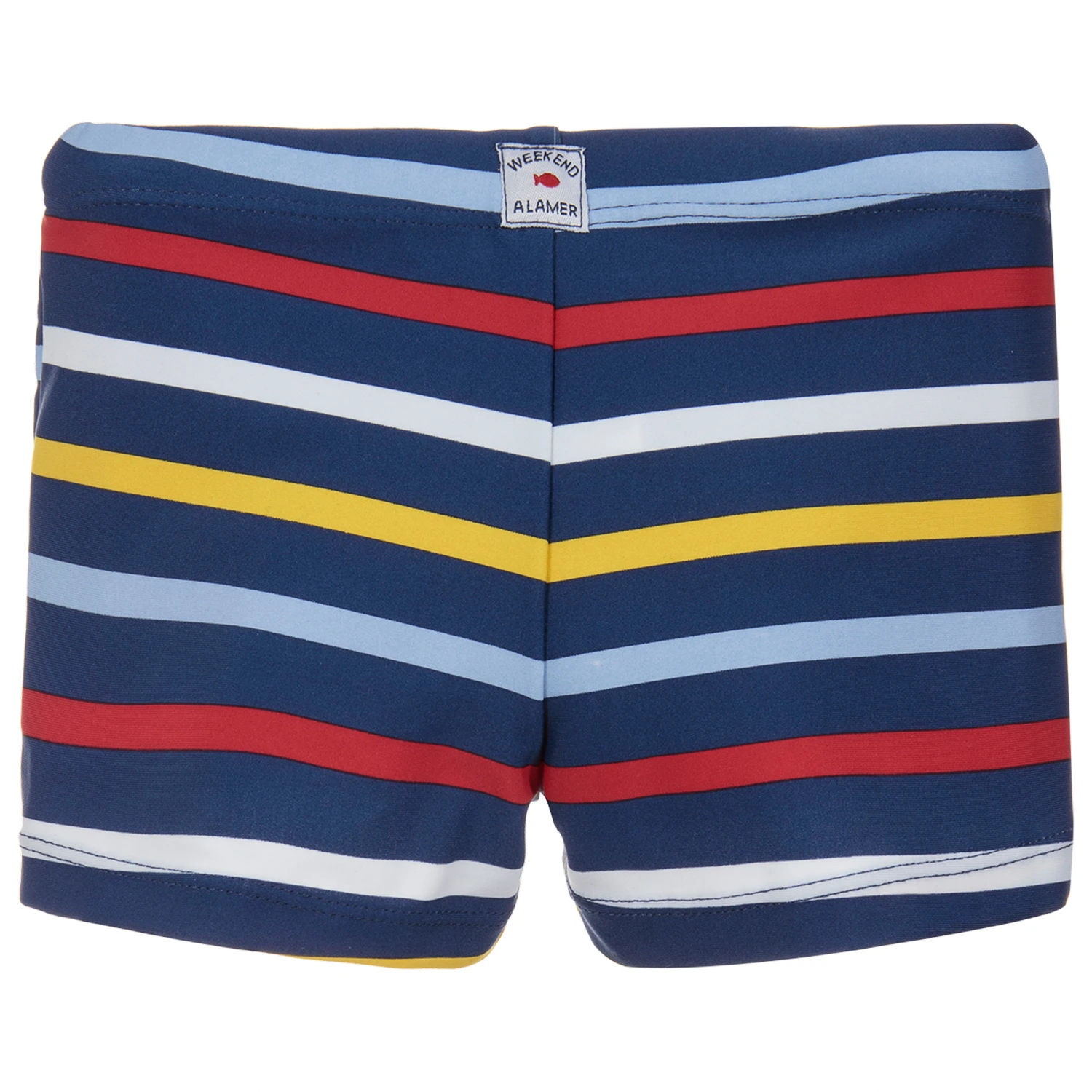 Little boys navy blue striped swim shorts from Week-end à la mer. Soft and stretchy, with an elasticated waistband.